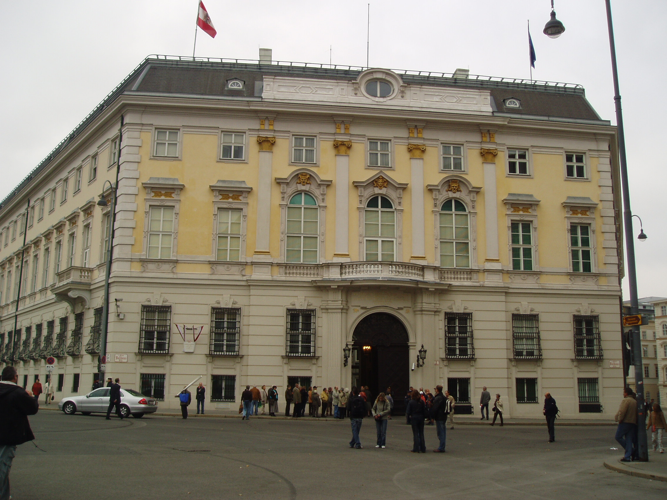 Nyilvános 1465 | 3327 | Ballhausplatz 2. Kancellári palota | A tér arról a régen lebontott bálházról kapta a nevét, amelyet a térbe torkolló Schauflergasse sarkán az 1525-ben Spanyolországból átvett "bál"-játékok megrendezésére I. Ferdinánd császár épített. Kétszáz évvel később emelte Johann Lukas von Hildebrandt a képen látható palotát. Ebben politizált annakidején Kaunitz és Metternich kancellár, majd utódaik. Ebben az épületben ölték meg 1934-ben Dolfuss kancellárt. 1814-15-ben itt tárgyalt és táncolt a napóleoni háborúk után összeült kongresszus. Az itt megrendezett fényes bálokon Bihari János is muzsikált. |