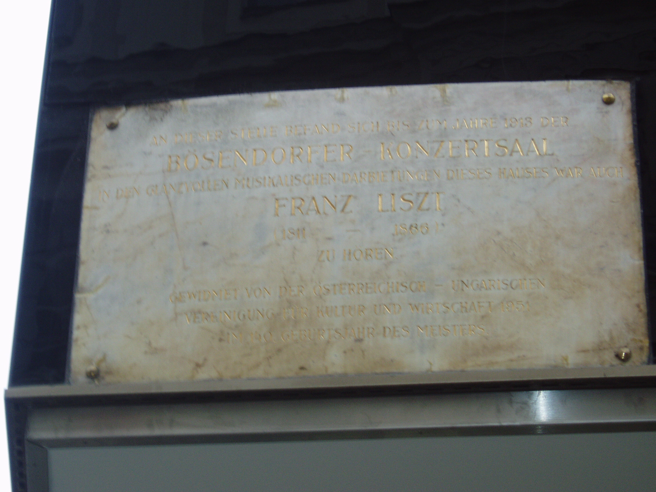 Nyilvános 1106 | 1906 | Herrengasse 8. Liszt Ferenc emléktáblája | A mai épület helyén egykor állott házban volt a Bösendorfer zongoragyár koncertterme. Számos jeles muzsikus lépett itt fel, köztük Liszt Ferenc, mint a homlokzaton elhelyezett emléktáblán is olvasható. |
