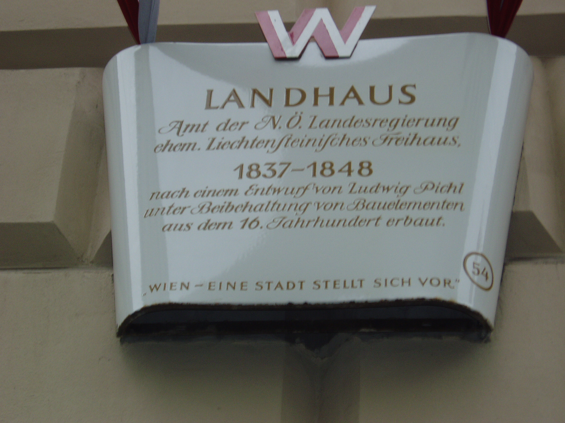 Nyilvános 1415 | 3072 | Herrengasse 13. Landhaus (a régi országház) műemléki táblája | A hatalmas palota építési ideje nem ismert, de az 1500-as években már állt. Azóta többször átépítették, jelenlegi klasszicista köntösét 1832-48 között kapta. Ebben a palotában ült össze évszázadokon keresztül, I. Miksa uralkodása óta az alsó-ausztriai rendi gyűlés. Ma az alsó-ausztriai kormány hivatala. Klasszicista Festsaal-ja (ünnepi terem) nevezetes hangversenyek színhelye volt. Falai között megfordult Schubert, Beethoven, s itt adta első bécsi koncertjét egy 12 éves magyar csodagyermek, Liszt Ferenc. |