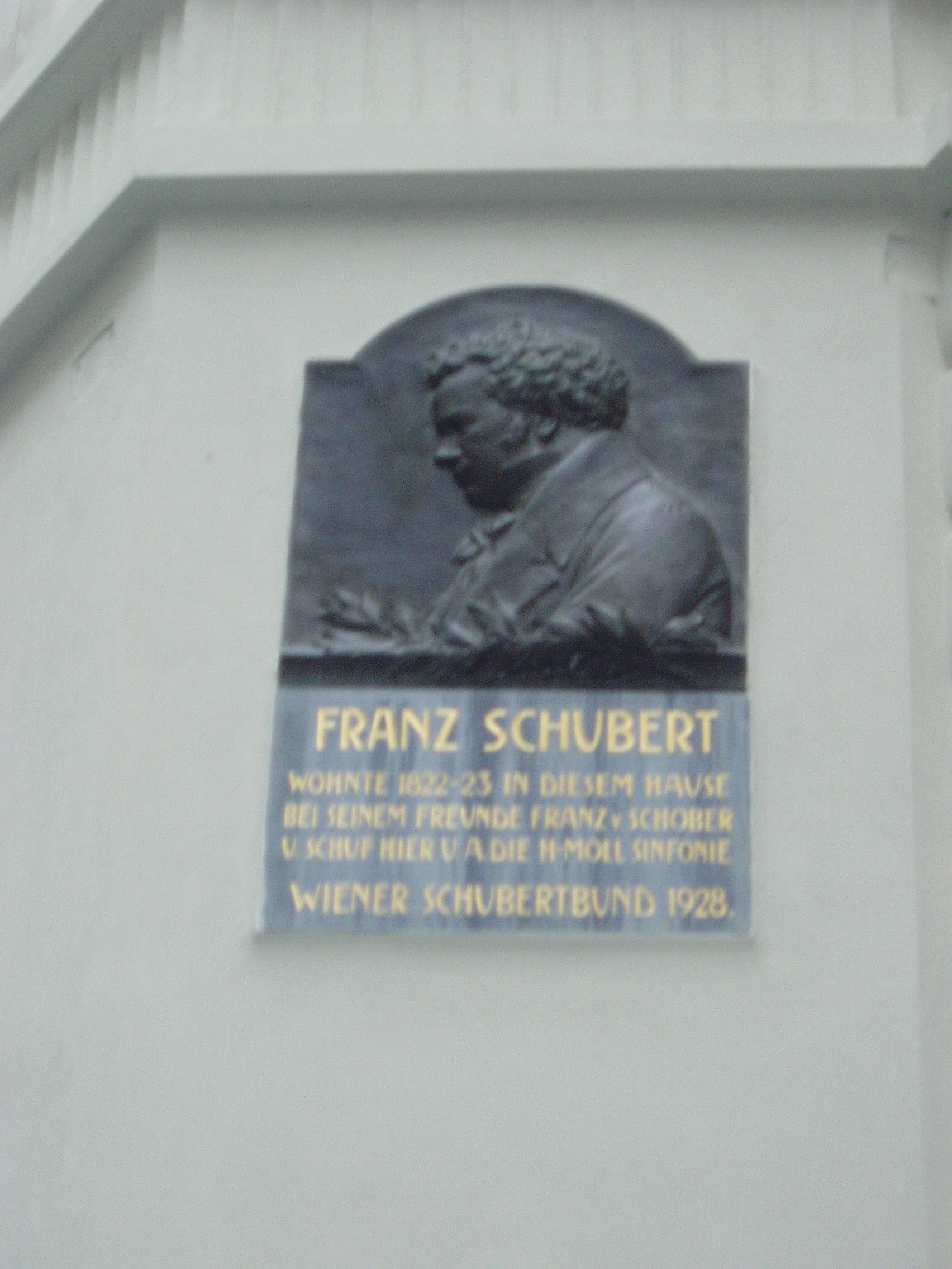 Nyilvános 1064 | 1943 | Spiegelgasse 9. | 1822/23-ban ebben a házban lakott Franz Schubert egyik barátjánál (neki magának sohasem volt lakása), s itt komponálta Befejezetlen szimfóniáját. A ház homlokzatán Schubert portrédomborművel díszített emléktáblája látható. |