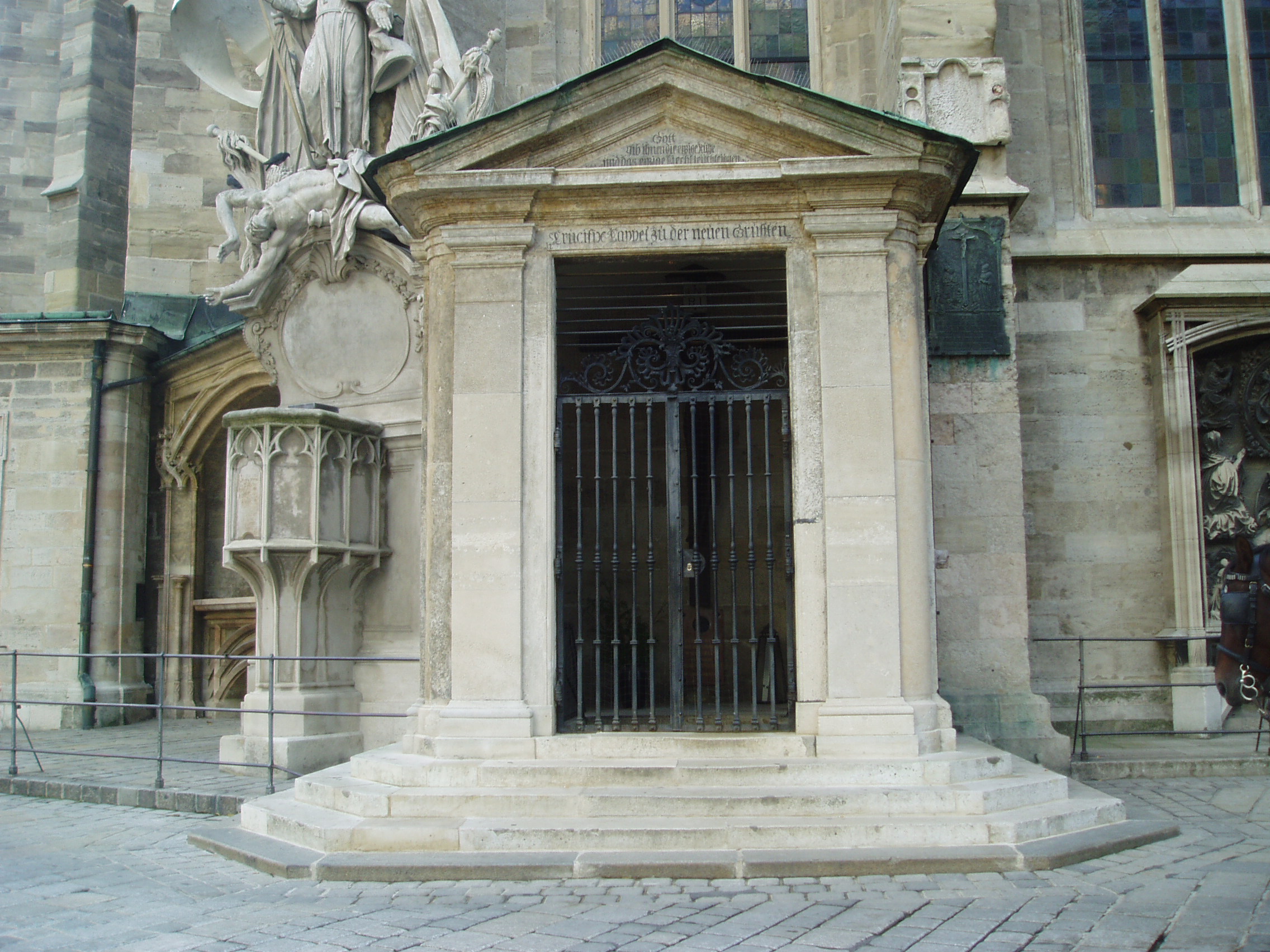 Nyilvános 1165 | 2499 | Ha kívülről megkerüljük a Stephansdom épületét, a hátsó oldalánál, ahol a fiákeresek gyülekeznek, egy kis oldalkápolnát találunk. Itt ravatalozták fel a beszentelés után Mozart holttestét és innét vitték ki a St.Marx-temetőbe, hogy aztán sírhelye örökre feledésbe merüljön. Ha benézünk a kápolna rácsain, Mozart emléktábláját olvashatjuk. | |
