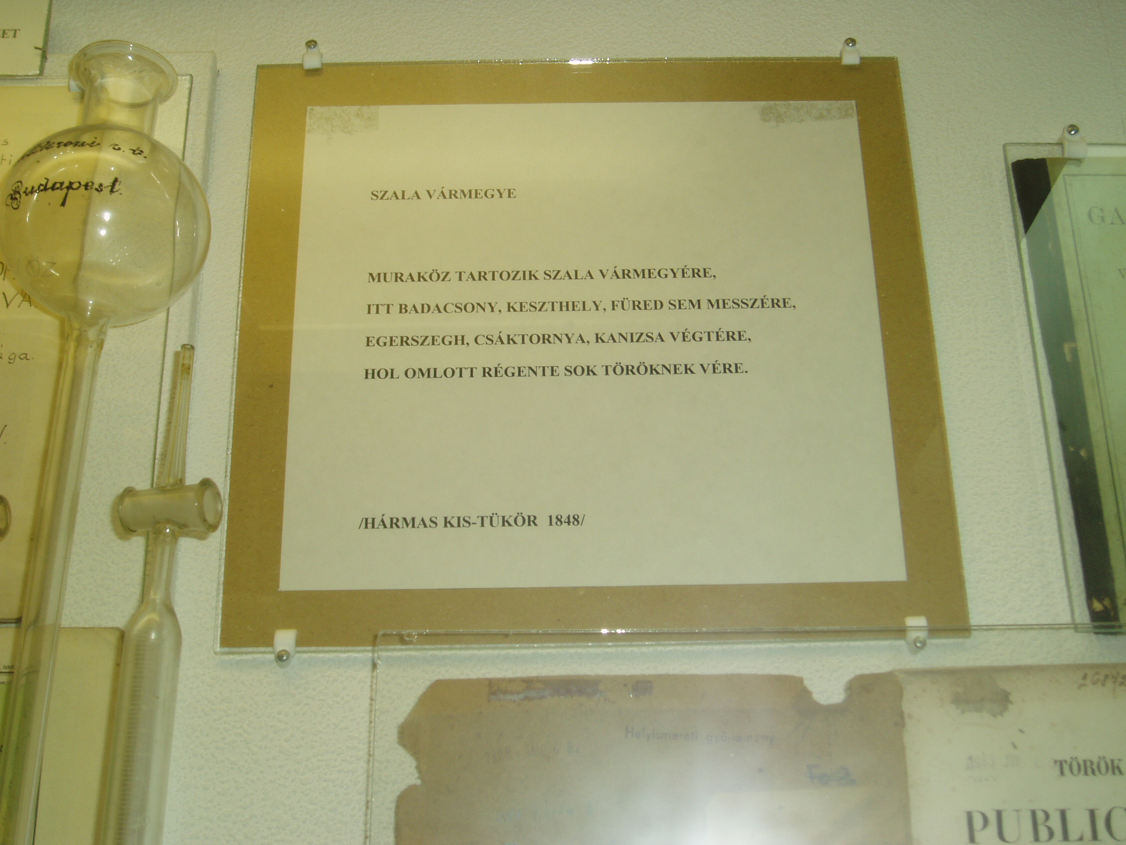 Nyilvános 1032 | 1715 | Tapolca: Templom domb 8. Múzeum | A múzeum épülete, az ún. Kántorház - a város védett építészeti emléke - Tapolca történelmi városközpontjában, a Malom-tó fölötti Templom dombon található. Ide járt elemi iskolába a város nagy szülötte, Batsányi János költő. Az épületben 1733-tól 1884-ig folyt az elemi iskolai oktatás. A múzeum iskolatörténeti kiállításán olvasható idézet, Zala vármegye verses összefoglalása a Hármas kis-tükör c. 1848-as tankönyvből. A felvétel 2007 februárjában készült. Felh. irod.: Látnivalók Veszprém megyében. Miskolc, Well-PRess, 2000 Hangodi László: Múltbanéző - kiállításvezető a Tapolcai Városi Múzeum tárlataihoz. Tapolca, 2006 |