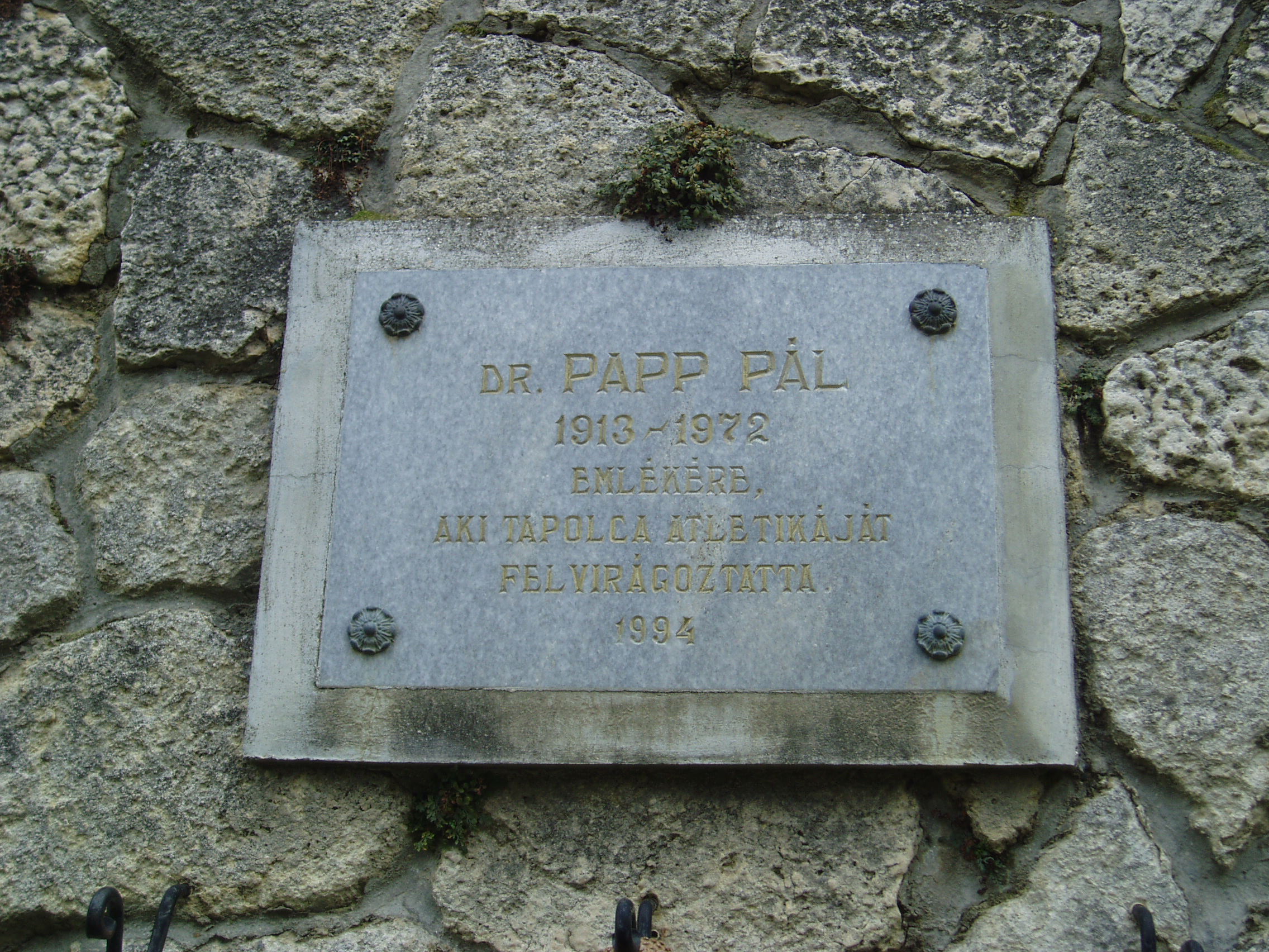 Nyilvános 1006 | 1647 | Tapolca, Városi Panteonfal: Papp Pál emléktáblája | A Malom–tó mögött álló magas kőfal a Városi Panteonfal, amelyen több neves, tapolcai kötődésű személyiségnek állítottak emléktáblát. Dr. Papp Pál (1913-1972) atlátaedző Tapolca sportéletének jeles alakja, felvirágoztatója volt. A felvétel 2007 februárjában készült. Felh. irod.: Bándi László: Emlékhelyek Veszprém megyében. Veszprém, 1996 www.tapolca.hu |