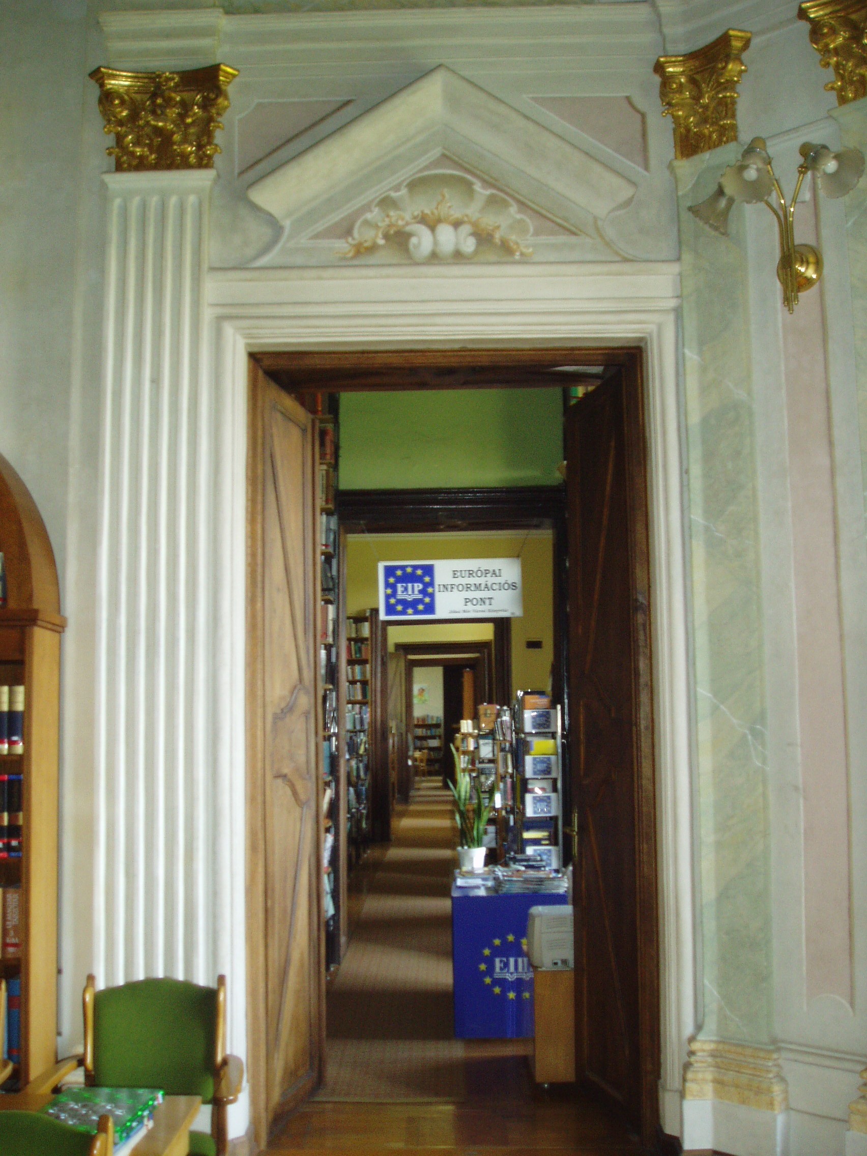 Nyilvános 1026 | 1860 | Pápa, Fő tér 1-3. Esterházy-kastély | A barokk kastély a korábban itt állott végvár helyére épült, részben annak alapfalai, kövei felhasználásával. A régi várat az 1740-es évektől Esterházy Ferenc (1683–1754) tárnokmester kezdte átalakítani Franz Anton Pilgram tervei alapján. A barokk várkastély kialakítása 1784-re fejeződött be Esterházy Ferenc fia, Eszterházy Károly egri püspök idejében Fellner Jakab, majd Grossmann József vezetésével. Az U alakú, egyemeletes épület a versailles-i palota nyomán elterjedt francia kastélytípus képviselője. Az épület keleti szárnyának emeletén volt a kastély kápolnája. Az 1988/89-ben végzett restaurálás eredményeképpen ma újra megcsodálható a helyiség eredeti architektúrája és Joseph Ignaz Mildorfer 1750 körül festett mennyezetképe, amely Krisztus mennybemenetelét ábrázolja. A kápolnában, amelynek példaszerű felújításáért a város 1990-ben Europa Nostra díjat kapott, ma a Jókai Mór Városi Könyvtár olvasóterme működik. A fénykép 2007 áprilisában készült. Felh. irod.: Németh Adél - Szabó Lajos: Pápa. Bp. Panoráma, 1989 Pápa. Szerk. Sz. Farkas Aranka. Bp., Magyar Képek, 2000 |