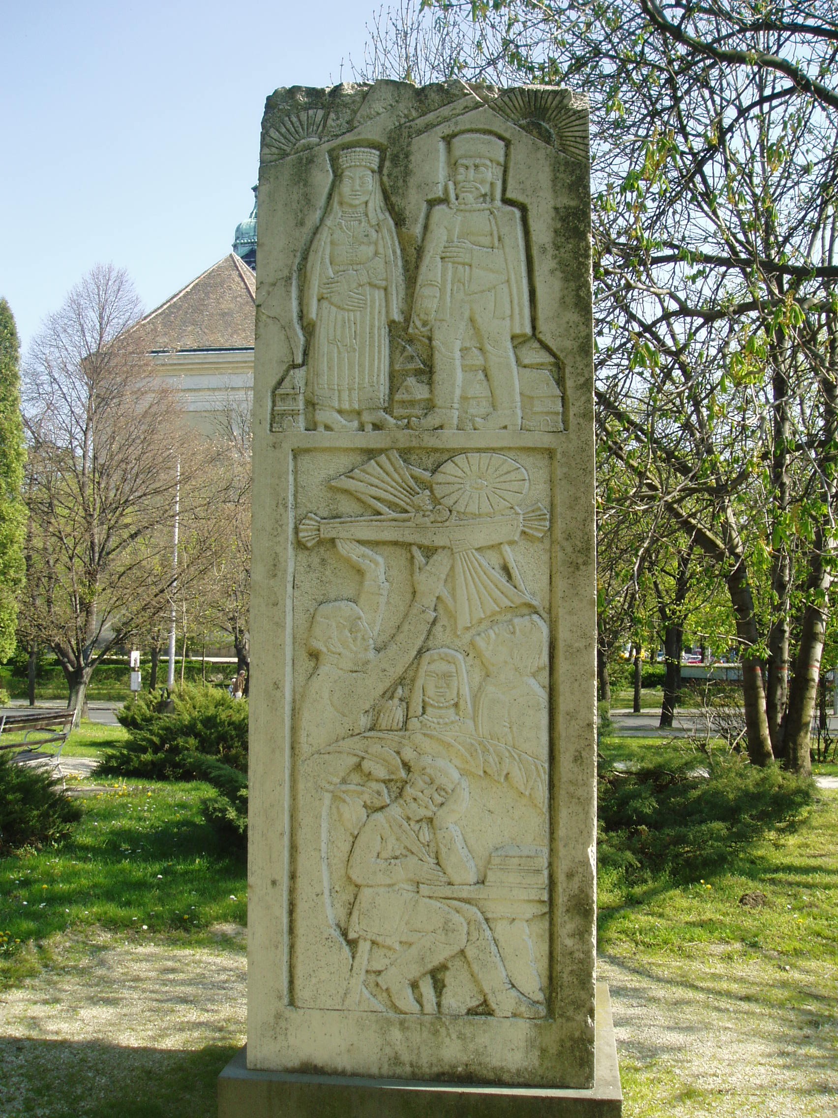 Nyilvános 1028 | 1631 | Pápa, Fő tér 1-3. Jókai-oszlop | Az Esterházy kastély előtti, a Fő tér felé néző parkban két egykori pápai diák - Jókai Mór és Petőfi Sándor - emlékére állított szoborkompozíció áll. Jókai Mór emlékoszlopa Szervátiusz Jenő és Szervátiusz Tibor alkotása. A négyzetes hasáb alakú mű felületét Jókai Mór és regényalakjainak domborműves ábrázolásai borítják. A fénykép 2007 áprilisában készült. Felh. irod.: Németh Adél - Szabó Lajos: Pápa. Bp. Panoráma, 1989 |
