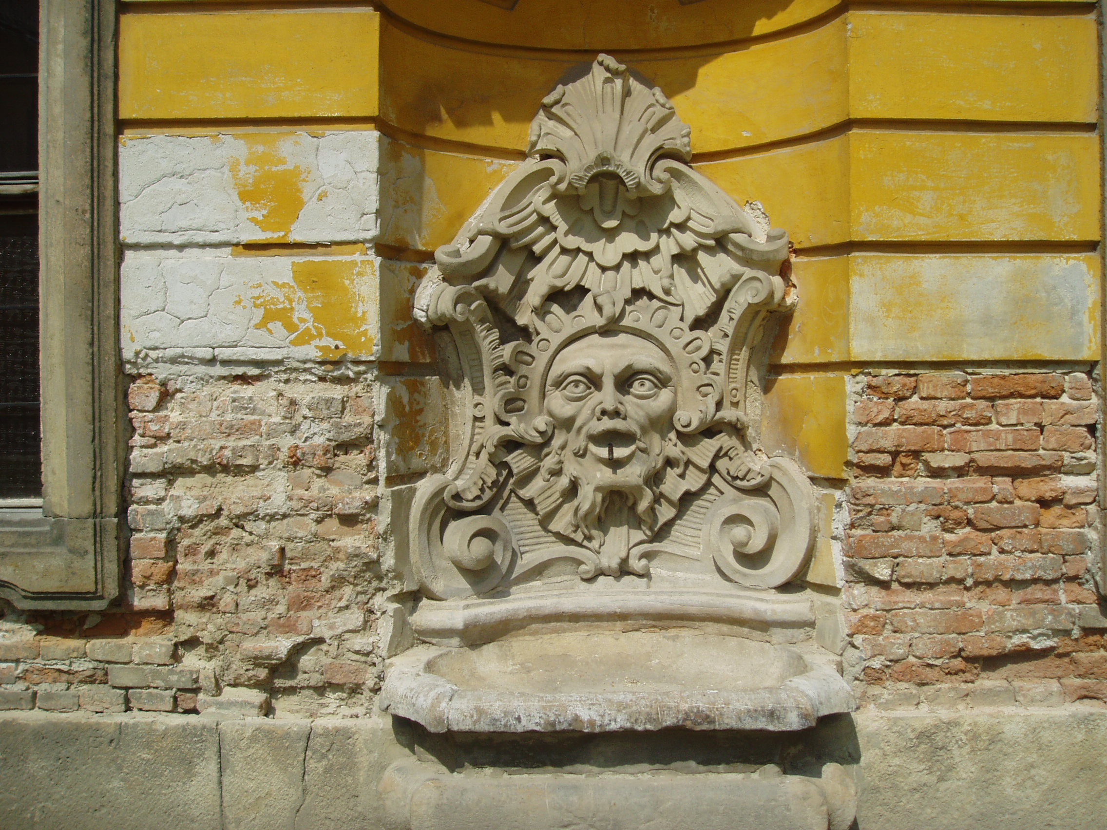 Nyilvános 1072 | 1811 | Pápa, Fő tér 1-3. Esterházy-kastély | A barokk kastély a korábban itt állott végvár helyére épült, részben annak alapfalai, kövei felhasználásával. A régi várat az 1740-es évektől Esterházy Ferenc (1683–1754) tárnokmester kezdte átalakítani Franz Anton Pilgram tervei alapján. A barokk várkastély kialakítása 1784-re fejeződött be Esterházy Ferenc fia, Eszterházy Károly egri püspök idejében Fellner Jakab, majd Grossmann József vezetésével. Az U alakú, egyemeletes épület a versailles-i palota nyomán elterjedt francia kastélytípus képviselője. A képen a főbejárat két oldalán állóvízköpős, gazdagon faragott díszkút egyike látható. A fénykép 2007 áprilisában készült. Felh. irod.: Németh Adél - Szabó Lajos: Pápa. Bp. Panoráma, 1989 Pápa. Szerk. Sz. Farkas Aranka. Bp., Magyar Képek, 2000 |
