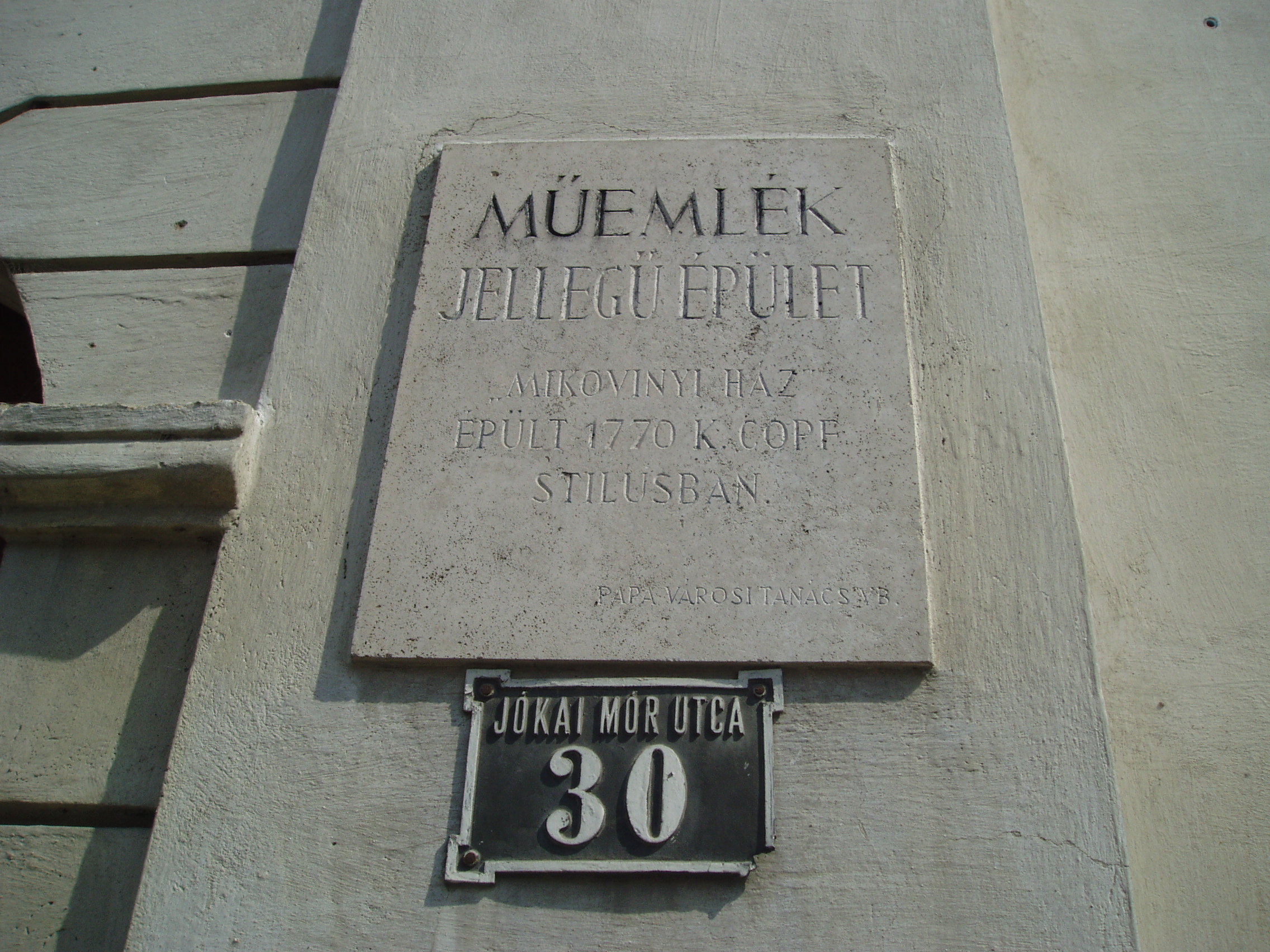 Nyilvános 1031 | 1647 | Pápa, Jókai utca 30. | Az utca talán legszebb épülete az ún. Mikovinyi-ház. 1770 körül épült copf stílusban, Fellner Jakab tervei szerint. Itt lakott kollégiumi diák korában Kerkapoly Károly későbbi pénzügyminiszter. Kerkapoly Károly (Szentgál, 1824. máj. 15. – Bp., 1891. dec. 31.) író, miniszter, történész, jogász. Petőfi és Jókai iskolatársa volt a pápai református kollégiumban (lásd: Pápa, Petőfi u. 13.). Jogot végzett, Halléban és Berlinben egészítette ki tanulmányait. Tehetségét Deák Ferenc is nagyra értékelte. Meghívták Pápára a bölcselet tanárának. A szabadságharcban a veszprémi nemzetőrség tagjaként vett részt. A kiegyezés idején Deák-párti programmal Enying, majd 1869–1878 között Tapolca választotta meg országgyűlési képviselőnek. 1870–1873 között pénzügyminiszter, majd egyetemi tanár. 1878-ban visszavonult, gazdálkodott, faiskolát, gyümölcsöst, szőlőt telepített. Tevékenyen részt vett a kor gazdasági mozgalmaiban. Bölcseleti munkái Hegel, közgazdasági tanulmányai Smith és Ricardo hatását mutatják. A fénykép 2007 áprilisában készült. Felh. irod.: Németh Adél - Szabó Lajos: Pápa. Bp. Panoráma, 1989 Veszprém megyei életrajzi lexikon. Veszprém, Veszprém Megyei Önkormányzat Közgyűlése, 1998 |