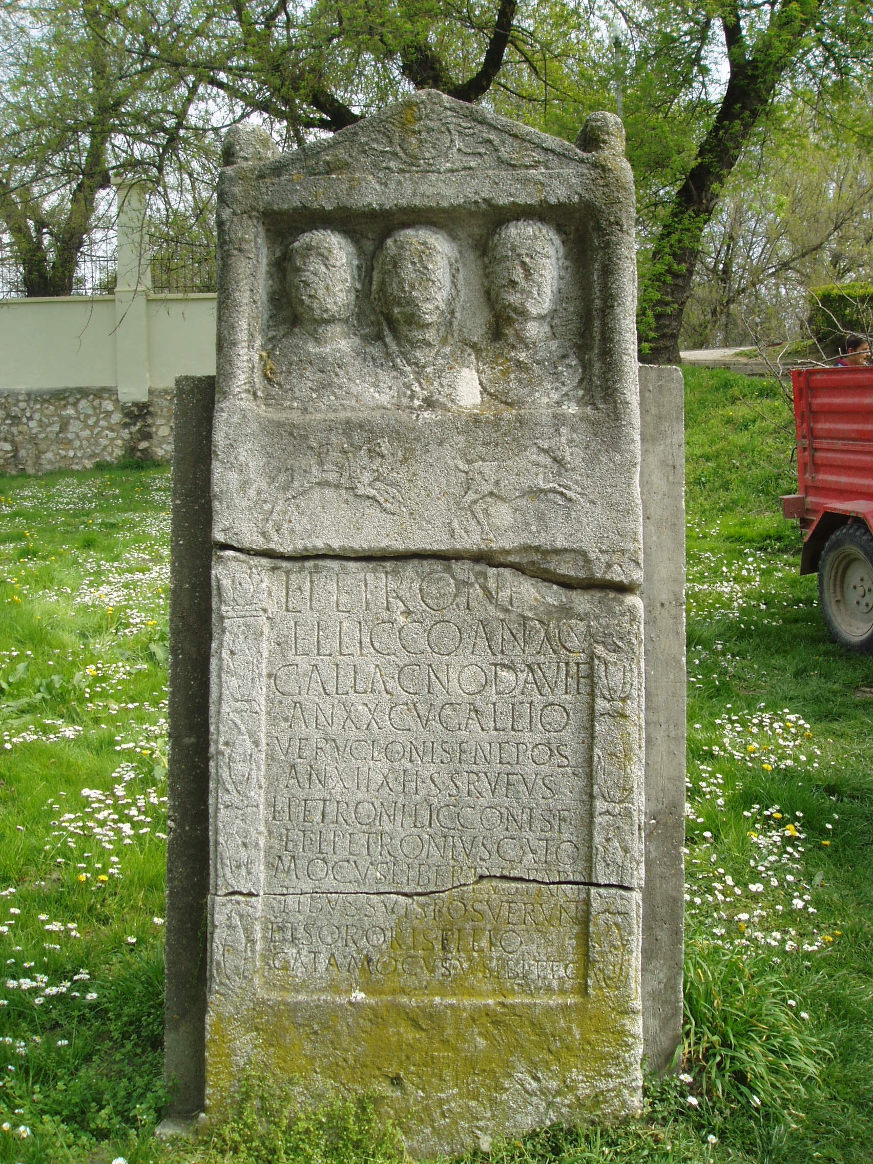Nyilvános 1090 | 2313 | Pápa, Köztársaság liget 1. | A színház parkjában állították fel a Pápa közelében, Diósdon talált régi római sírkövet. A sírkő egy egykori sírláda fedlapja, mely mészkőből készült. A timpanon díszítésében medúzafő és delfinek láthatók. A három alak ábrája a sírban nyugvó három személyre utal. A sírfelirat szerint a családfő a Petronius nemzetséghez tartozott. Felszabadított rabszolga volt, de jelentős üzleti karriert futott be, s egy kereskedőcég pannóniai képviselője lett. A fénykép 2007 áprilisában készült. Felh. irod.: Jankó László: A kisdiósi Petronius sírkő. = Archaelógiai Értesítő, 1928. 207-210. p. Tóth István: Feliratos római kőemlékek Pápán. = Pápai Múzeumi Értesítő 1995. 160-162. p. Czuppon Elek - Jankó László - Sarudy György: Egy érdekes sírkő Pápán [ ... ]. = Pápai Hírlap, 1927. július 30. - október 15. |
