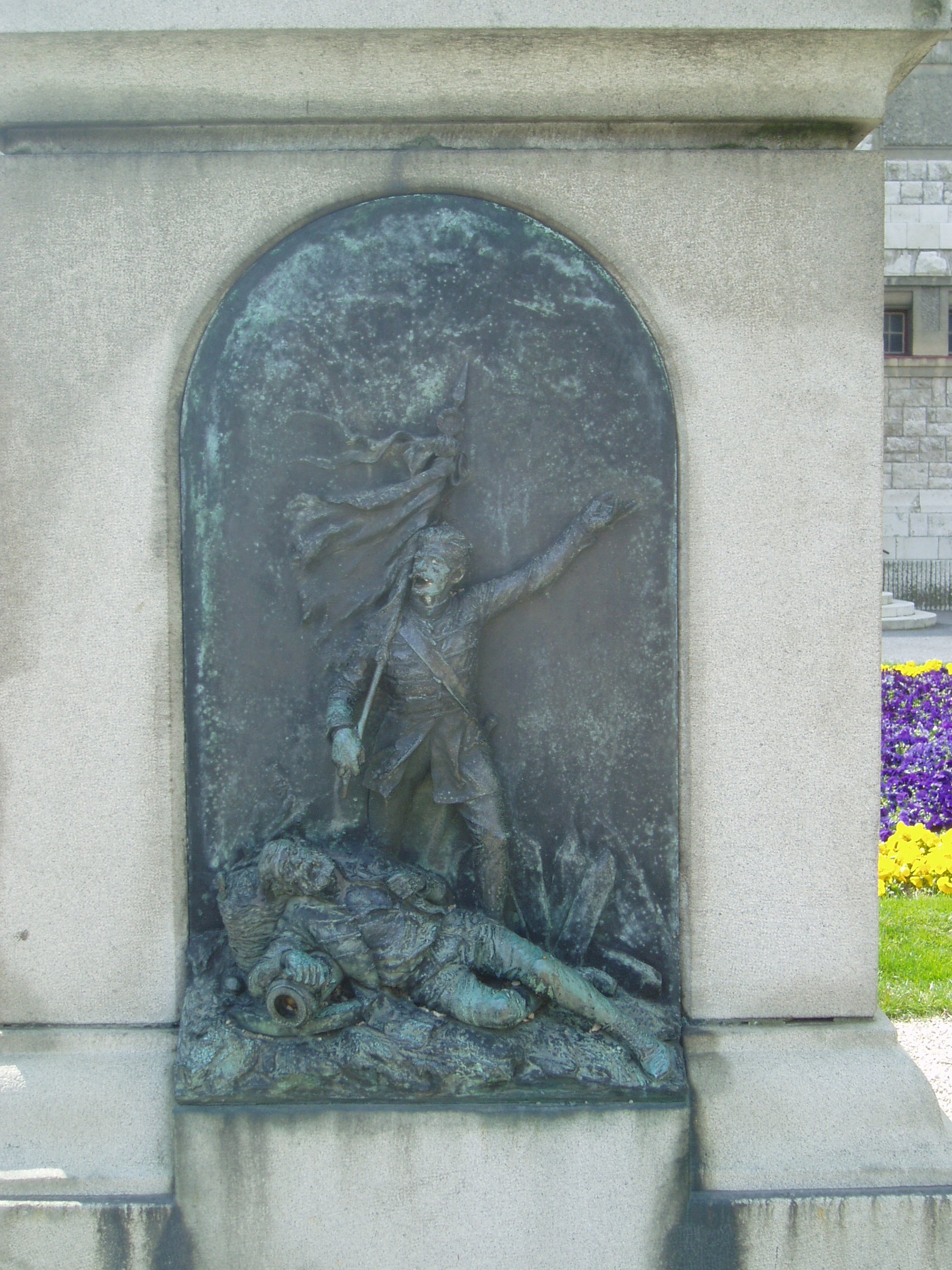Nyilvános 1003 | 1643 | Pápa, Március 15. tér: Honvéd emlékmű | A református templom előtti kis parkban, a Jókai utca felőli oldalon álló Honvéd emlékmű ifj. Vastagh György alkotása. 1896-ban állították fel a Pápa melletti ihászi csata emlékére. A hengeres oszlopon kiterjesztett szárnyú, bronz turulmadár ül. A négyzetes talapzaton levő bronzrelief csatajelenetet ábrázol. A szabadságharc egyetlen Veszprém megyei csatája 1849. június 27-én zajlott le Ihász térségében (korábban, június 13-án Kmetty György győzelmet aratott Csornán). Június 27-én az ihászi pusztán Kmetty megtámadta a Marcaltő elfoglalására siető Schütte osztrák tábornokot. A csata nem végződött egyértelmű győzelemmel, de a magyaroknak heves ágyútűzzel sikerült hátráltatni az osztákokat. Azonban az erős osztrák lovasság Kmetty csapatait végül visszanyomta Pápa felé. A fénykép 2007 áprilisában készült. Felh. irod.: Németh Adél - Szabó Lajos: Pápa. Bp. Panoráma, 1989 |