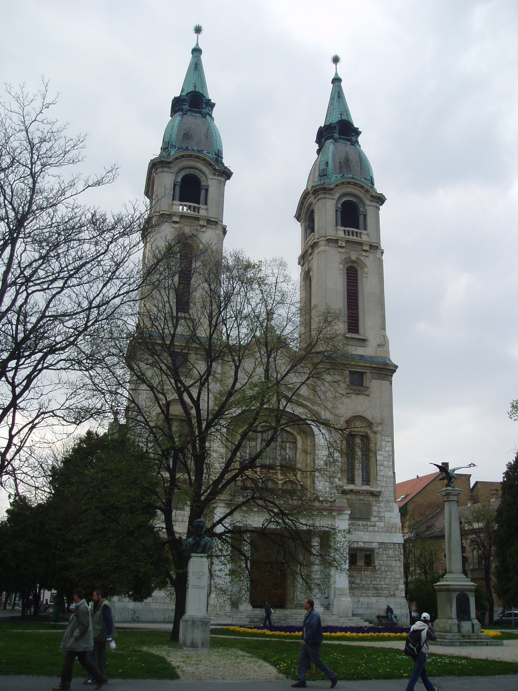 Nyilvános 1063 | 1692 | Pápa, Március 15. tér: Református nagytemplom | A templom a Március 15. tér közepén emelkedik, az 1931-ben lebontott Jókai Színház helyén. 1881 és 1930 között itt állt Pápa első állandó színháza. Korábban — az 1800-as évek elejétől — a színházi előadásokat a Griff szálló nagytermében (lásd: Pápa, Fő tér 15.) tartották. Ünnepélyes avatását 1881. december 7-én tartották; a prológ megírására az egykori pápai diákot, Jókai Mórt kérték fel. A színháznak nem volt állandó együttese, épületében évente több színtársulat is megfordult. A színház csillagos órái közé tartozott Blaha Lujza néhány vendégszereplése. Prielle Kornélia is játszott vendégként a színpad deszkáin. 1905-ben valóságos láz tört ki a városban, amikor Pálmay Ilka operettdalokkal vendégszerepelt a színházban. A pápai kőszínház fennállásanak évtizedei alatt olyan híres prózai színészek is megfordultak itt vendéként, mint Jászai Mari és Márkus Emília. Lebontása előtt az utolsó előadás főszerepét Beregi Oszkár játszotta. 1906-ban a református egyház azzal az igénnyel lépett fel, hogy a színház helyén templomot építhessen. Sok vita után és megfelelő anyagi kártérítés kikötésével a város 1910-ben helyt adott a kérésnek, de a templom csak 1931-34 között épült fel Dudás Kálmán budapesti építész tervei alapján (az új színházépület viszont évtizedekkel később, az 1970-es évek végén nyílt meg a Köztársaság ligetben). A neobarokk stílusú, kéttornyos, monumentális templom a tér hosszanti irányában helyezkedik el. Főhomlokzatán az oszlopos, erkélyes főbejárat felett íves oromzat köti össze a kétrészes sisakkal fedett tornyokat. A fénykép 2007 áprilisában készült. Felh. irod.: Németh Adél - Szabó Lajos: Pápa. Bp. Panoráma, 1989 Nádasdy Lajos: A pápai kőszínház története 1817-1931. Veszprém, Veszprém Megyei Tanács, 1981 |