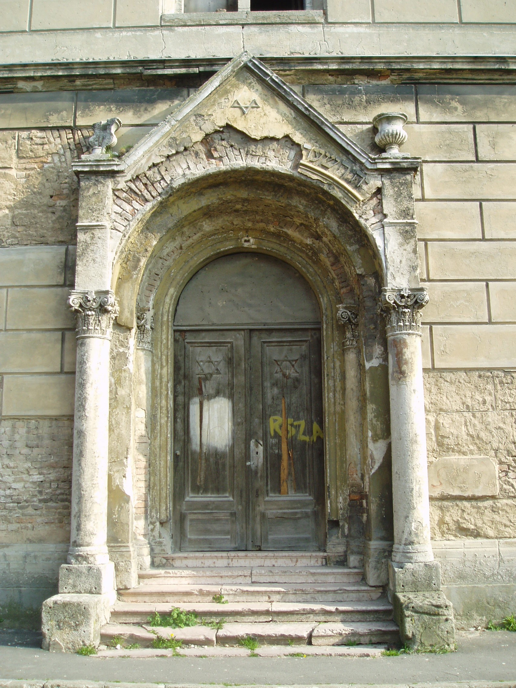 Nyilvános 1046 | 1708 | Pápa, Petőfi utca 21. Zsinagóga | A napjainkig eredeti formában fennmaradt zsinagóga építését 1844-ben kezdték el. A 398 m2 alapterületű, közel 20 méter magas épületet Löw Lipót rabbi szentelte fel 1846-ban. A főbejárat a vallási előírásoknak megfelelően a nyugati oldalon található. A zsinagóga puritán külső megjelenését csak a félköríves fülkékbe helyezett romantikus ikerablakok és a klasszicizáló oldalkijárat díszíti. A kétszintes karzatszerkezettel rendelkező, dekoratívan festett belső térben nyolcszáz férfi számára volt ülőhely. Az épület jelenleg (2007) rendkívül elhanyagolt állapotban van, felújításra vár. A fénykép 2007 áprilisában készült. Felh. irod.: Németh Adél - Szabó Lajos: Pápa. Bp. Panoráma, 1989 www.papa.hu |