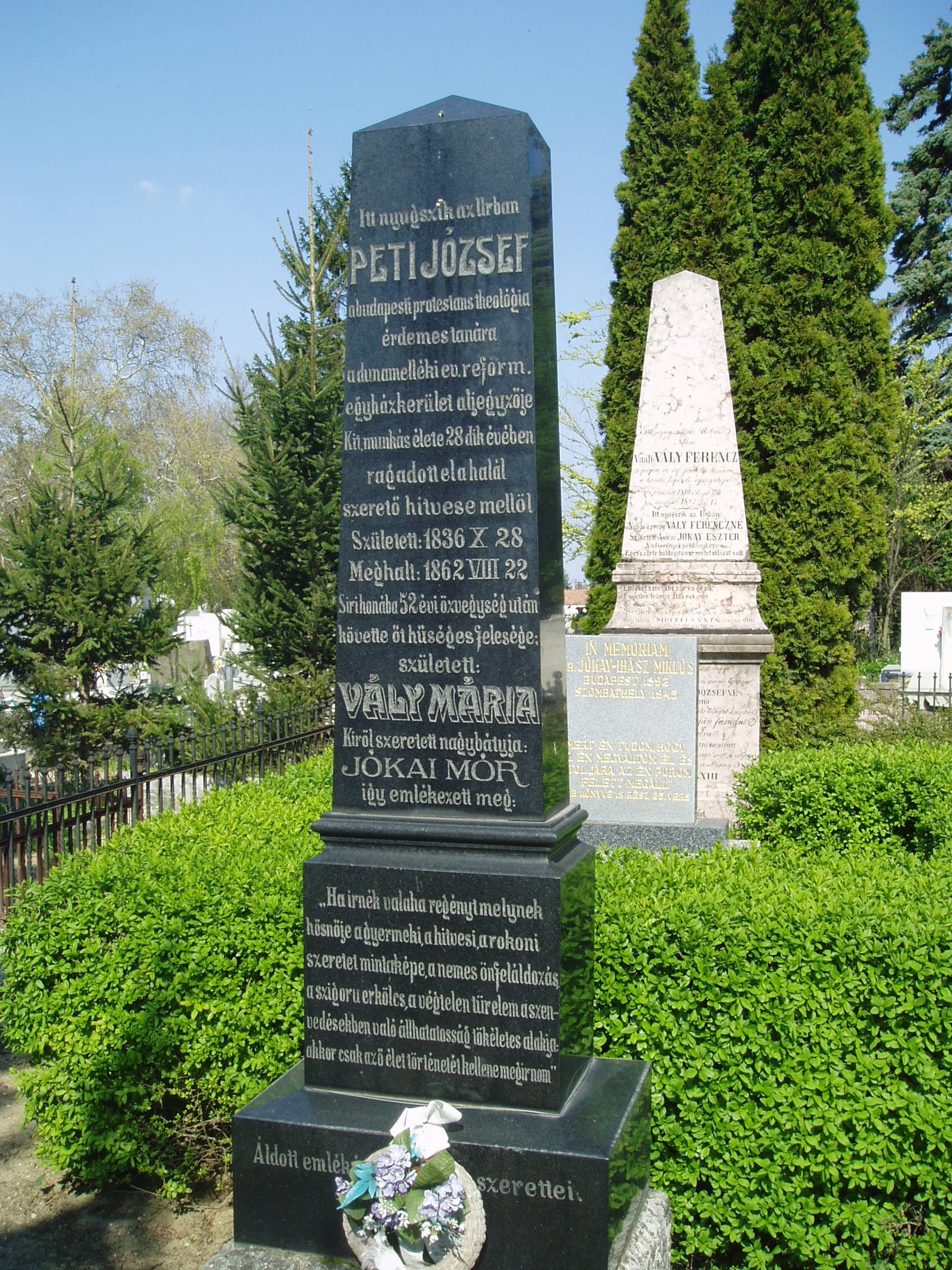 Nyilvános 1291 | 3559 | Rövid leírás | Teljes leírás (1.5 KB) | Pápa, Alsóvárosi temető: Vály Mari sírja A Jókai utcáról nyíló Temető utca vezet a XIX. század elején megnyílt Alsóvárosi köztemetőbe. A város sok neves személyiségének van itt a sírja. Itt nyugszik Vály Mari (Komárom, 1840. nov. 17. – Pápa, 1915. máj. 17.) emlékiratíró, Jókai Mór unokahúga (Eszter nővérének lánya, apja Vály Ferenc tanár). Férjének és gyermekének korai halála után Jókaiékhoz költözött, háztartásuk vezetésében segédkezett. Nagybátyja életét terjedelmes emlékiratban örökítette meg, amelyből szemelvényes kiadásban jelent meg: Emlékeim Jókai Mórról címmel csak részletek jelentek meg 1955-ben. Sírkövén nagybátyjának sorai olvashatók. Ugyanitt nyugszik férje, Peti József (Komlósd, 1831. okt. 24. – Pest, 1862. aug. 22.) tanár. Tanulmányait Csurgón kezdte, 1850-től Pápán, Bécsben és Bazelben folytatta, ahol teológiát is hallgatott. A pápai gimnáziumban 1856-ban, egy év múlva Kecskeméten, 1859-től Pesten a teológia tanára. A Duna-melléki Egyházkerület 1861-ben aljegyzővé választotta. Több tudományos értekezést írt, melyek a tiszántúli egyházi folyóiratokban és évkönyvekben jelentek meg. A fénykép 2007 áprilisában készült. Felh. irod.: Németh Adél - Szabó Lajos: Pápa. Bp. Panoráma, 1989 Veszprém megyei életrajzi lexikon. Veszprém, Veszprém Megyei Önkormányzat Közgyűlése, 1998 |