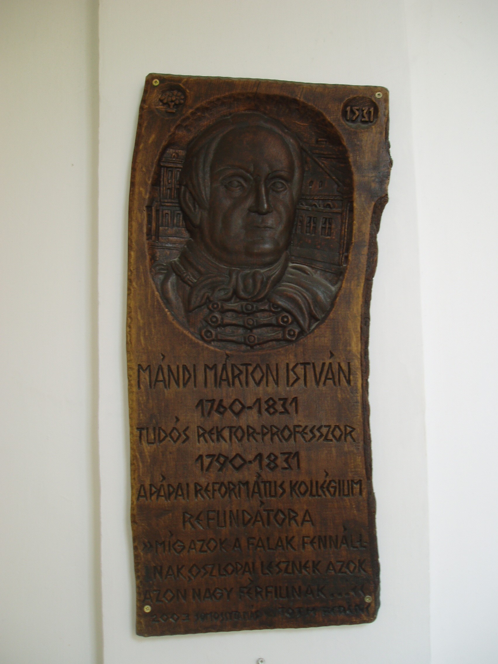 Nyilvános 982 | 1619 | Pápa, Március 15. tér 9. Pápai Református Kollégium Gimnáziuma | A híres pápai Református Kollégium első épülete 1531 és 1752 között a mai Ruszek közben, a Lábasház épületének helyén állott. 1752-ben - Mária Terézia rendeletének következtében, amely megszüntette a szabad vallásgyakorlást - harminckét évig csak a közeli Adásztevelen működhetett. 1784-ben, II. József türelmi rendeletének köszönhetően térhetett vissza az iskola Pápára, s hamarosan felépült a ma Ókollégiumként ismert épület (lásd: Pápa, Petőfi u. 13.), amelyben 1794-ben indulhatott meg az oktatás. Az intézmény 1857-ig működött ott, ekkor átköltözött a Március 15. tér 13-15. számú házba, az ún. Nátus-ba, majd 1895-ben utolsó végleles helyére, ide, a Március 15. tér 9. számú monumentális új épületbe. Az iskola folyosóin számtalan emléktábla, szobor, dombormű idézi az egykori kiváló tanárok, jeles diákok alakját. A képen Mándi Márton István fa reliefje látható, amely Somosi Tamás munkája. Mándi Márton István (Iszkaszentgyörgy, 1760. nov. 23. – Pápa, 1831. szept. 21.) nyelvész, tanár, filozófus. Kecskeméten, Debrecenben, majd Göttingában tanult. 1790-től volt a pápai református gimnázium rektor-professzora. Nevéhez fűződik az iskola új fellendülése. A filozófiában Kant követője volt és 1795-ben már Kant tanítása alapján tartott előadásokat, amelyekért súlyos bírálat érte. Síremléke az Alsóvárosi temetőben van (lásd: Pápa, Alsóvárosi temető,: Mándi Márton István sírja); márvány mellszobra, Izsó Miklós alkotása a református könyvtárban látható. A fénykép 2007 áprilisában készült. Felh. irod.: Németh Adél - Szabó Lajos: Pápa. Bp. Panoráma, 1989 http://refi-papa.hu |