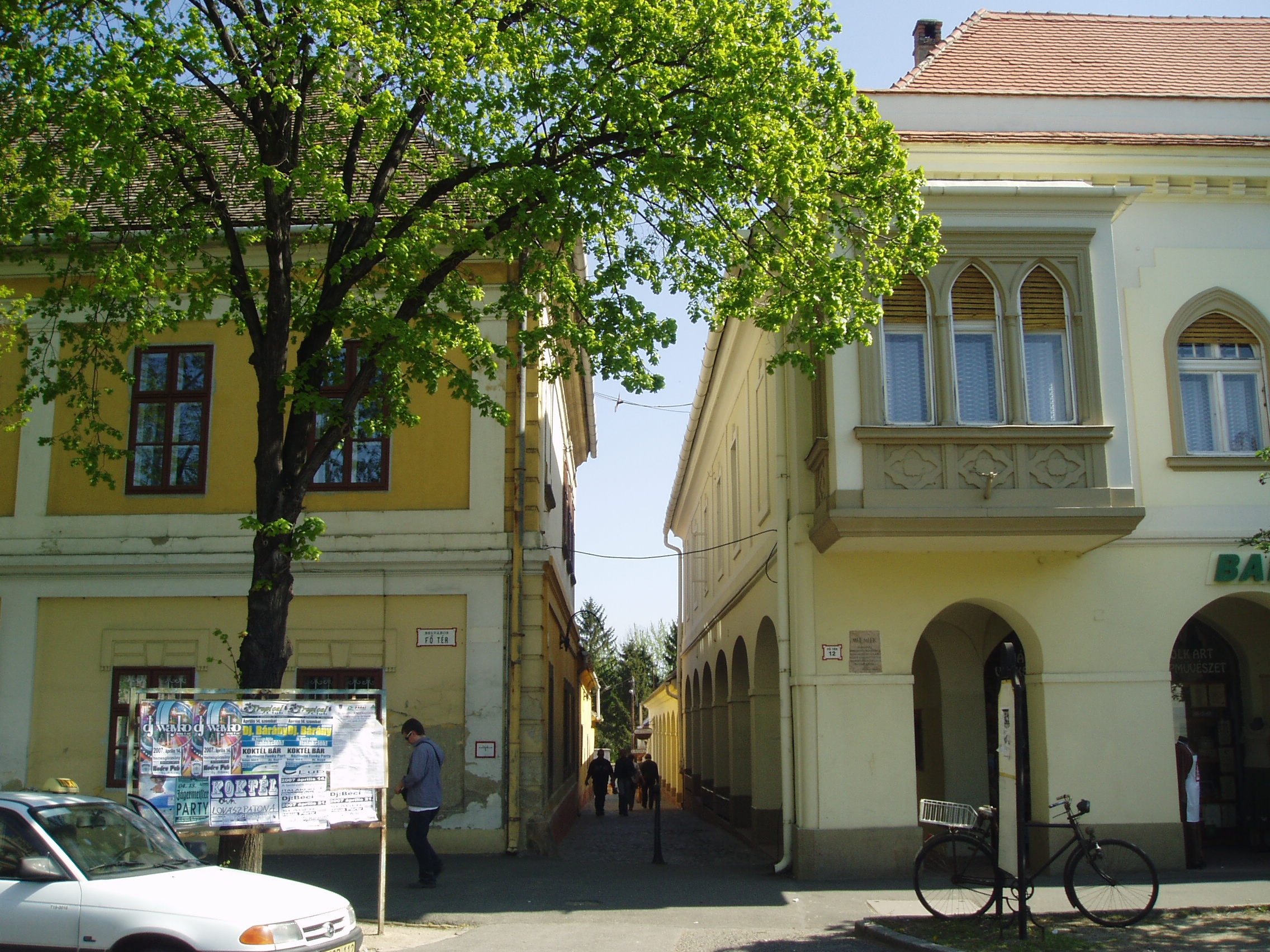 Nyilvános 982 | 2114 | Pápa, Ruszek köz (a Fő tér felől) | A Fő tér 11. és 12. számú épületek között nyílik a Ruszek köz. A bal oldali, egyemeletes épület (Fő tér 11.) a római katolikus plébániaház. A XVI. századi eredetű épület mai, jellegzetesen barokk megjelenését a XVIII. században nyerte. Jobbra az ún. Lábasház (Fő tér 12.) látható. A XVIII. századi, barokk stílusú épületet a keskeny Ruszek köz felőli oldalon hosszanti és harántívekkel ritmusosan tagolt folyosó tesz egységes megjelenésűvé. Valaha élénk kereskedelmi élet folyt itt. Az épület Fő tér felőli homlokzata a XIX. században neogótikus külsőt kapott. A Lábasház helyén volt a híres református kollégium első épülete. Eredetileg katolikus iskola volt, amely 1531-ben alakult át a protestánsok tanintézetévé, majd egy hosszabb fejlődési idő alatt, 1585-ben főiskolábá vált. 1752-ig állt ezen a helyen. Mária Terézia rendeletére ekkor szüntették meg a reformátusok vallásgyakorlatát, s az iskolát a közeli Adásztevelre száműzték, ott működött harminckét évig. 1784-ben térhetett vissza Pápára, s hamarosan felépült új otthona (lásd: Pápa, Petőfi u. 13.). Besétálva a Ruszek közbe, a nagy múltú iskola emléktáblája a bal oldali épületen olvasható. A fénykép 2007 áprilisában készült. Felh. irod.: Németh Adél - Szabó Lajos: Pápa. Bp. Panoráma, 1989 |