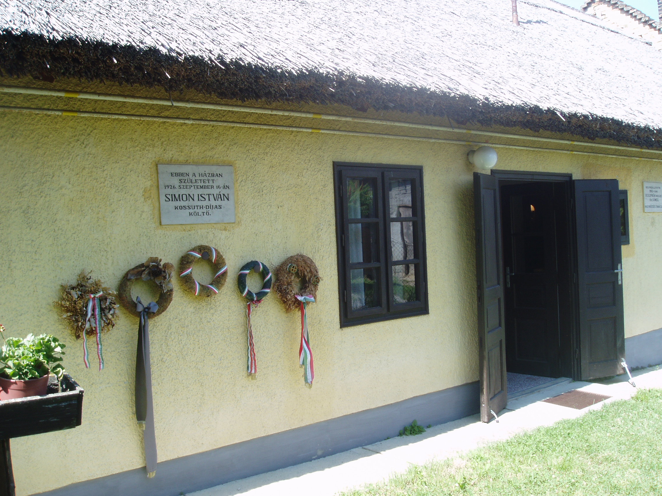 Nyilvános 1251 | 2912 | Bazsi, Fő út 149. | 1926. szeptember 16-án itt, az udvari házrészben született Simon István költő. A kis épületet 1983. április 11-én, a költészet napján, országos ünnepség keretében avatták emlékházzá. Benne ma is a költő szüleinek eredeti bútorai és tárgyai láthatók, Simon Istvánról szóló dokumentációval kiegészítve. Simon István tizennyolc éves koráig élt Bazsiban. A sümegi gimnáziumot bejáró diákként végezte el. 1948-tól Budapesten lakott, de gyakran hazajárt szülőfalujába. Számos, ebben a házban készült fényképen látható idős szüleivel a már nagy elismertséget elért költő. 1975 nyarán nagybetegen került a sümegi kórházba, ahol július 6-án elhunyt. Kívánságának megfelelően Bazsiban temették el (sírjánál sajnos nem jártam, a temető elég messze van a falutól - K.K.). A szegényparaszti környezet, a szülőföld, a Sümeg környéki táj mindvégig éltető eleme volt költészetének. A fénykép 2007 júniusában készült. Felh. irod.: Erős Zoltán: Magyar irodalmi helynevek A-tól Z-ig. Bp. Kis-Lant Kiadó, 1995 |