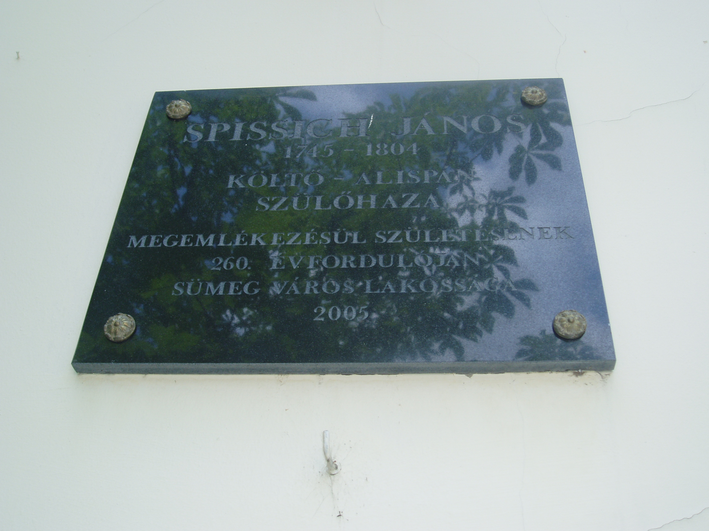 Nyilvános 1009 | 1584 | Sümeg, Deák F. u. 6. | Mint a homlokzaton elhelyezett emléktáblán is olvasható, ebben a házban születetett 1745-ben Spissich János költő-alispán. Spissich János (Sümeg, 1745. márc. 28 – Kisgörbő, 1804. ápr. 25.) költő, alispán. Régi horvát nemesi családból származott. Apja Sopron megyei szolgabíró. 1761-ben Trencsében lépett a jezsuita rendbe, Kőszegen, Gyöngyösön, Komáromban tanított. 1771-ben megvált a rendtől, Zala vármegyében aljegyző, 1780-tól főjegyző. 1781-től az Eltz-uradalom (Szlavónia) jószágkormányzója, majd Zala megyei alispán, 1790–1791-ben országgyűlési követ. A francia forradalommal rokonszenvező ellenzéki magatartása miatt kegyvesztetté vált. József nádor vizsgálatot rendelt el ellene, de tisztázni tudta magát. 1797. ápr. 12-i zalai megyegyűlés elmozdította az alispánságból, 1798-tól kisgörbői birtokán élt. Szabadkőműves, a zalaegerszegi nagypáholy vezetője. Baráti viszonyban volt Kazinczyval, Pálóczi Horváthtal. Jelen volt Széchényi Ferencnél tartott ülésen, amelyen a tudós társaság felállítását tervezték. Versei közül A jövendő századnak c. emelkedik ki. Beszélt a magyaron kívül olasz, német, latin, szláv és orosz nyelven. A fénykép 2007 júniusában készült. Felh. irod.: Veszprém megyei életrajzi lexikon. Veszprém, 1998 |