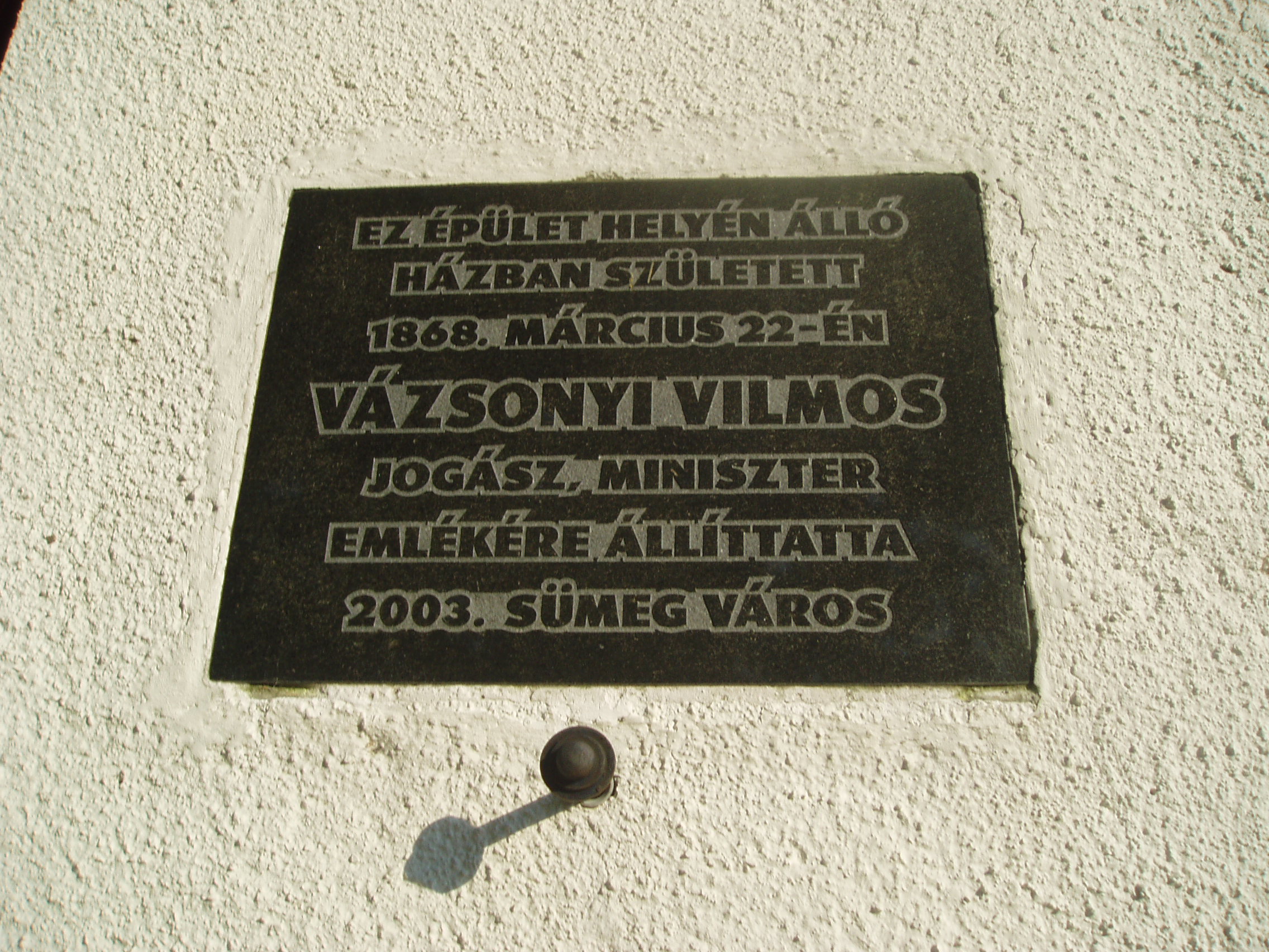 Nyilvános 1002 | 1589 | Sümeg, Flórián tér - Árpád utca sarok | A modern áruház Árpád utca felőli oldalán Vázsonyi Vilmos jogász, miniszter, politikus emléktáblája olvasható, aki a korábban ezen a helyen állott házban született 1868. március 22-én. jogász, miniszter, politikus. A budapesti egyetemen jogot végzett, majd ügyvédként dolgozott. 1894-ben megalapította a Demokratikus Kört és még ugyanabban az évben bekerült Budapest törvényhatóságába. 1901-ben demokrata párti programmal országgyűlési képviselő. 1904-ben a vasutassztrájk idején a sztrájkolók és a kormány közötti tárgyalásokat vezette, majd a perbe fogott vasutasok védelmét látta el. 1917–1918-ban igazságügy-miniszter két kormányban is. Fellépett a háborúellenes és a forradalmi mozgalmak ellen. Az őszirózsás forradalom napján emigrált és csak az ellenforradalom hatalomra jutása után tért haza. Az újjászervezett Nemzeti Demokrata Polgári Párttal a legitimistákat támogatta. 1924-ben már a baloldali ellenzék egy részét összefogó Demokrata Blokk létrehozásában és tevékenységében is közreműködött. A frankhamisítási ügy parlamenti tárgyalásán a kisebbségi vélemény egyik szerkesztője, emiatt soviniszta körök részéről súlyos támadások érték. Külföldre utazott gyógykezeltetés céljából és a frankhamisítás bírósági tárgyalása idején hirtelen meghalt Badenben 1926. május 29-én. Bátyja, a Csabrendeken született Vázsonyi Jenő gépészmérnök, aki 1918-tól államtitkári címmel az államvasutak elnökigazgatója volt. Vezetése idején kezdődött meg hazánkban a vasútvonalak villamosítása. Szerepe volt Budapest utcai világításának korszerűsítésében és a hazai tőzegtermelés megindításában. Verus álnéven verseket is írt, amelyek Száz epigramma címmel jelentek meg. A fénykép 2007 júniusában készült. Felh. irod.: Veszprém megyei életrajzi lexikon. Veszprém, Veszprém Megyei Önkormányzat Közgyűlése, 1998 |