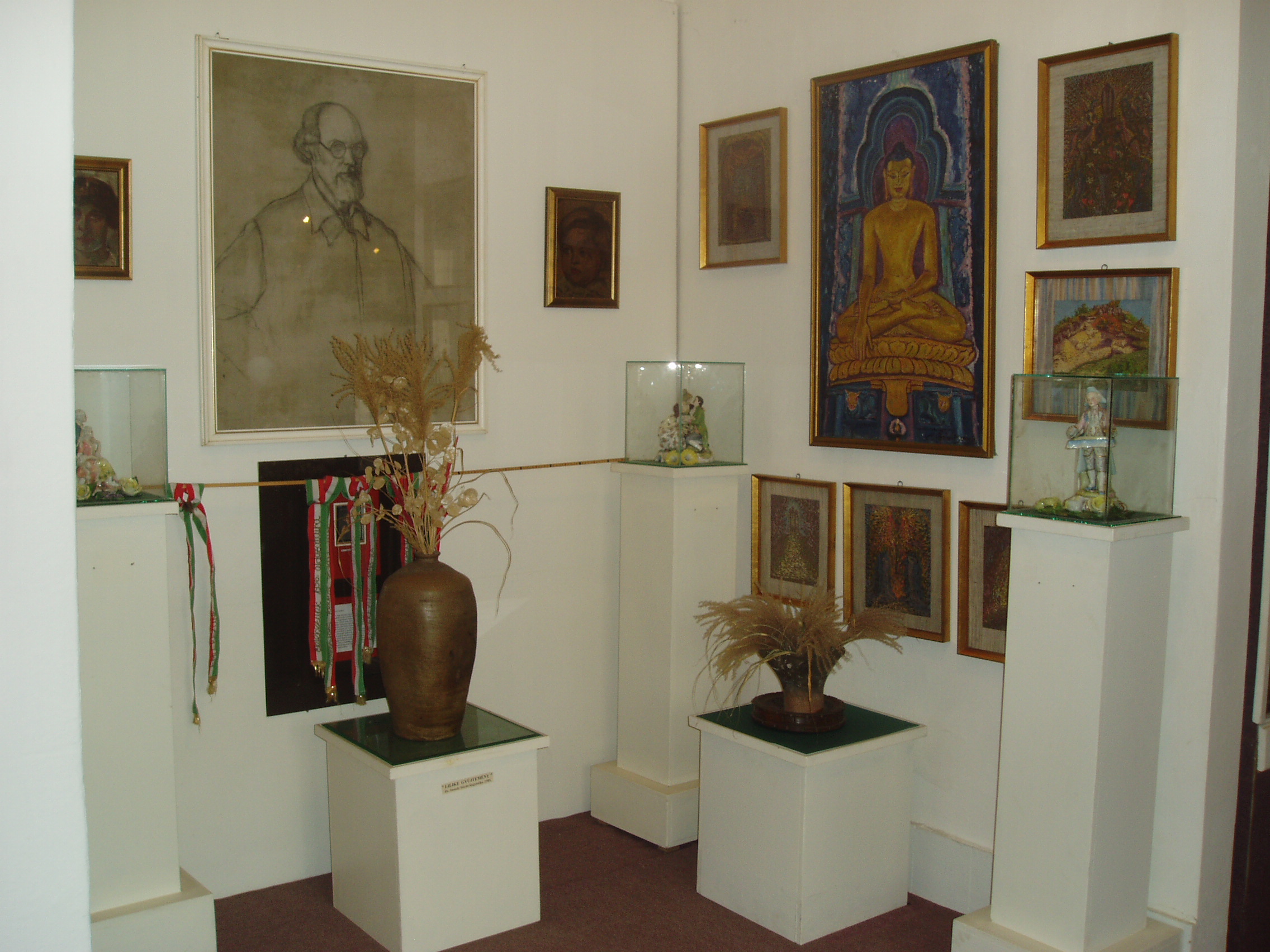 Nyilvános 1032 | 1676 | Sümeg, Kisfaludy tér 2. Városi Múzeum, Sass Brunner-emlékszoba | A Városi Múzeum ad otthont a Sass Brunner emlékkiállításnak is, amely Sass Brunner Ferenc, felesége, Sass Brunner Erzsébet és leányuk, Brunner Erzsébet festészeti munkáit mutatja be. Sass Brunner Ferenc az első világháború után telepedett le Sümegen (lásd még: Sümeg, Szent István tér 3., Sümeg, Temető). Nagykanizsai származású felesége és lánya 1928-ban Indiába utaztak és ott éltek életük végéig. Munkásságuk mára joggal bevonult a XX. század indiai festészetének klasszikusai közé. A kiállítás képanyaga jórészt Elizabeth Brunner adományaként került a múzeum tulajdonába. A művészektől a nagykanizsai Művészetek háza ("kiskastély") is őriz festményeket. A fénykép 2007 júniusában készült. Felh. irod.: Sümegi kalauz. Sümeg, Sümegi Fórum Alapítvány, 1993 |