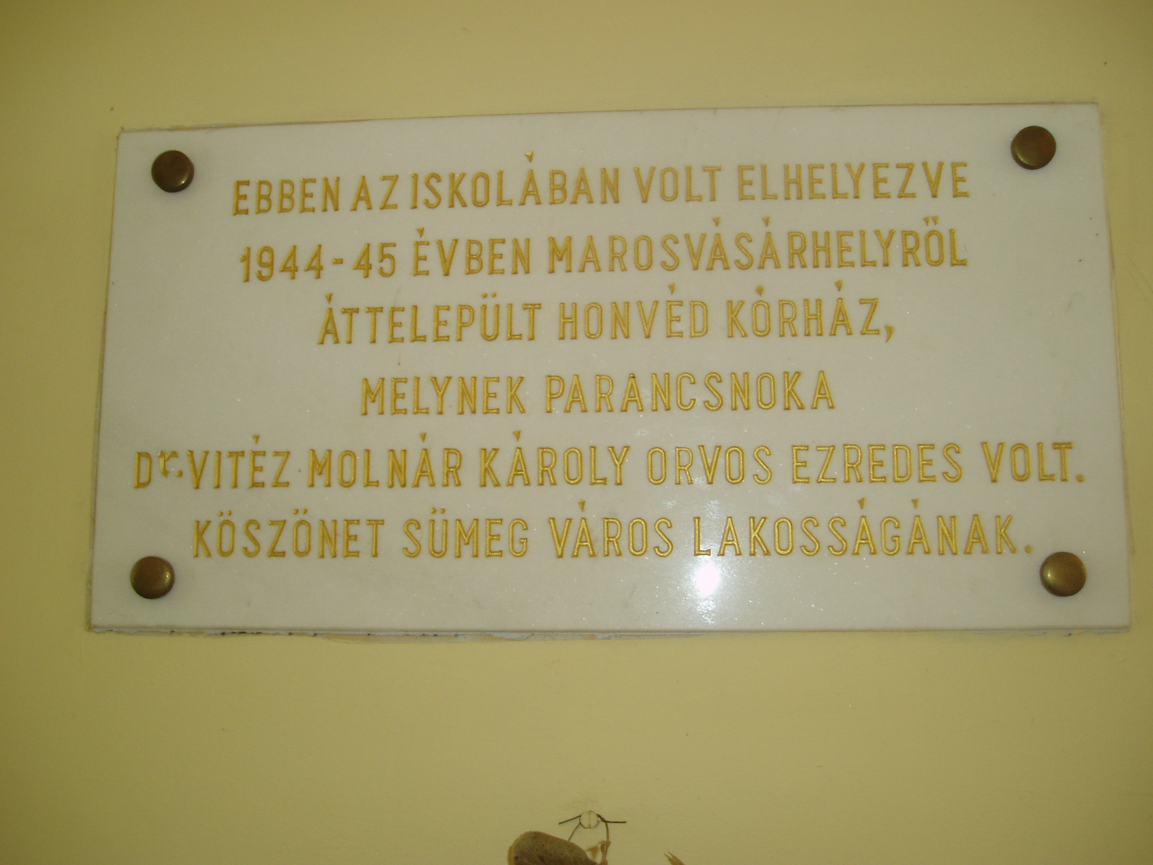 Nyilvános 1004 | 1543 | Sümeg, Mártírok útja 1. Kisfaludy Sándor Gimnázium | A Kossuth Lajos utca és a Mártírok útja sarkán magasodó többszintes épület a sümegi oktatás legimpozánsabb hajléka. Az iskola előcsarnokában több emléktáblát, udvarán pedig Kisfaludy Sándor szobrát helyezték el. A képen látható márványtábla a második világháborúra emlékeztet: az iskola épületében helyezték el 1944/45-ben a Marosvásárhelyről áttelepült honvéd kórházat. A fénykép 2007 júniusában készült. Felh. irod.: Koppány Tibor - Kozák Károly: Sümeg útikalauz. Veszprém, Idegenforgalmi Hivatal, 1965 Látnivalók Veszprém megyében. Miskolc, Well-PRess, 2004 Sümegi kalauz. Sümeg, Sümegi Fórum alapítvány, 1993 |