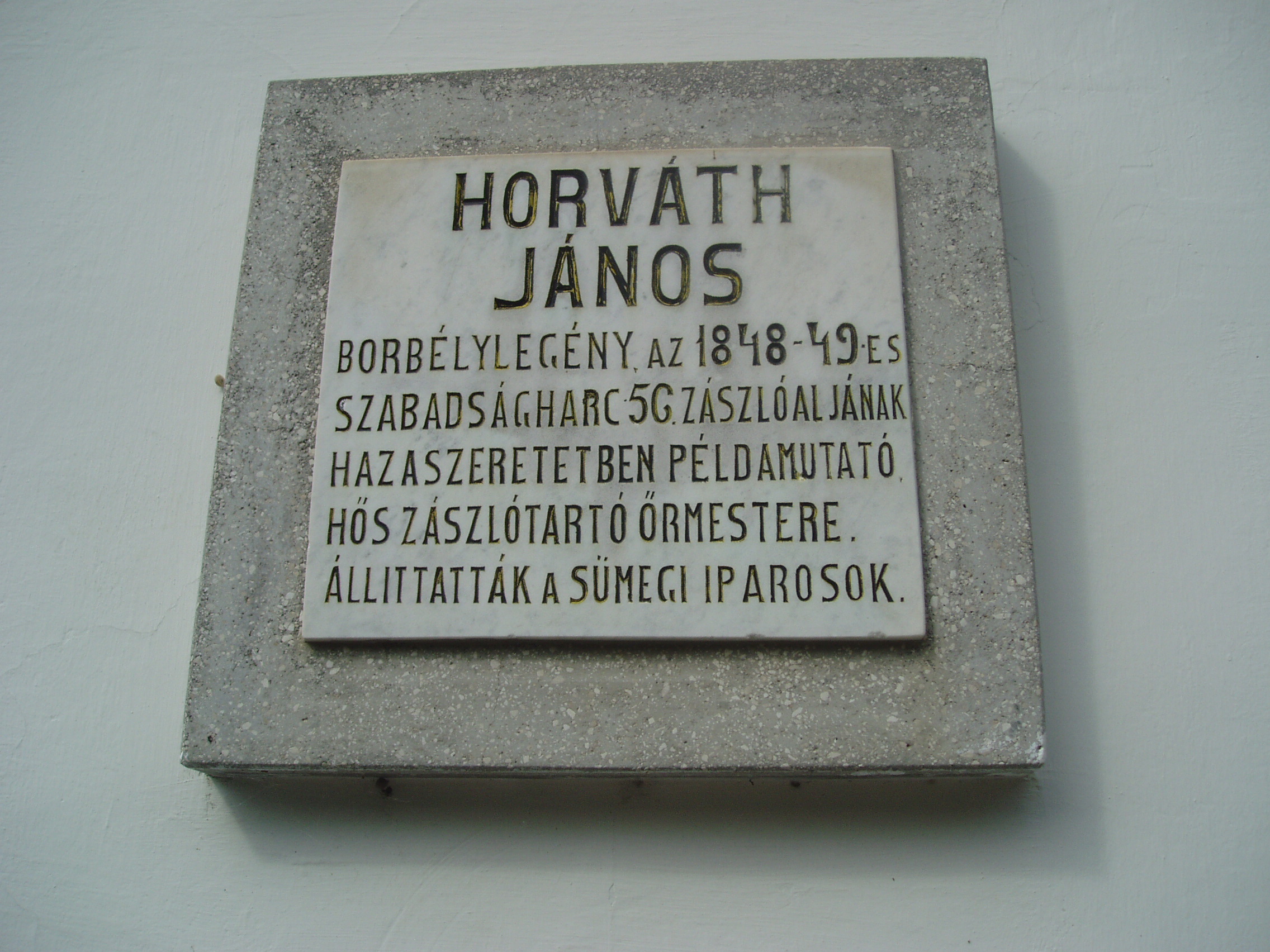 Nyilvános 995 | 1518 | Sümeg, Panteonfal. Horváth János emléktáblája | A Kisfaludy téren, Kisfaludy Sándor szülőháza előtt alakították ki Sümeg Panteonfalát. A képen Horváth János 1955-ben elhelyezett emléktáblája látható (a Veszprém megyei életrajzi lexikon nem említi). Felirata: HORVÁTH JÁNOS borbélylegény, az 1849-49-es szabadságharc 56. zászlóaljának hazaszeretetben példamutató, hős zászlótartó őrmestere. Állíttatták a sümegi iparosok. A fénykép 2007 júniusában készült. Felh. irod.: Koppány Tibor - Kozák Károly: Sümeg útikalauz. Veszprém, Idegenforgalmi Hivatal, 1965 Látnivalók Veszprém megyében. Miskolc, Well-PRess, 2004 Veszprém megyei életrajzi lexikon. Veszprém, Veszprém Megyei Önkormányzat Közgyűlése, 1998 www.ekmk.hu/emlekhely/Emlekhelyek.html |