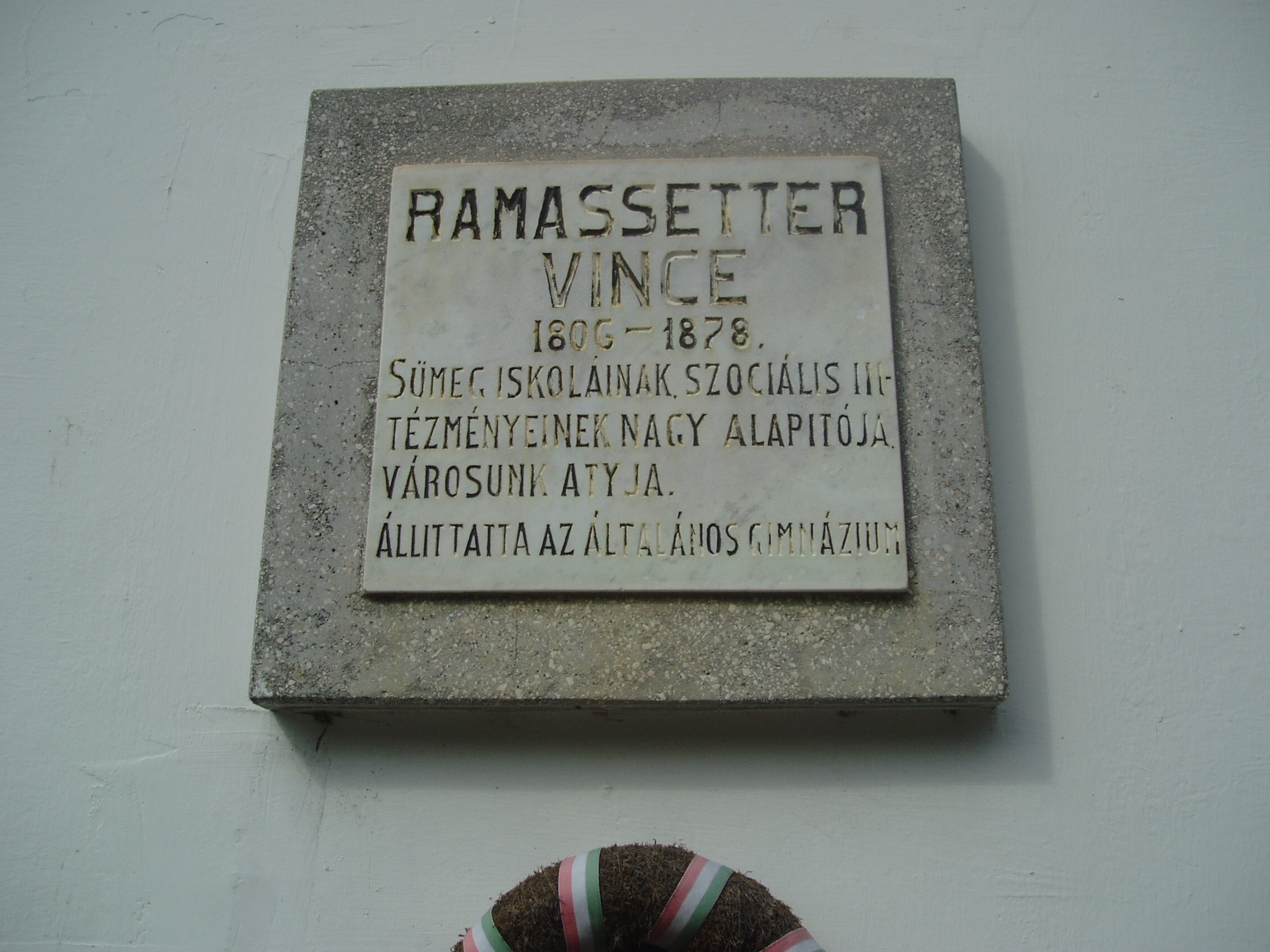 Nyilvános 989 | 1782 | Sümeg, Panteonfal. Ramassetter Vince emléktáblája | A Kisfaludy téren, Kisfaludy Sándor szülőháza előtt alakították ki Sümeg Panteonfalát. A képen Ramassetter Vince emléktáblája látható (1955). Felirata: RAMASSETTER VINCE 1806-1878. Sümeg iskoláinak, szociális intézményeinek nagy alapítója, városunk atyja. Állíttatta az Általános Gimnázium. Ramassetter Vince (Sümeg, 1806. febr. 8. – Sümeg, 1878. máj. 10.) kékfestő, iskolaalapító, “Sümeg atyja.” Kőszegen és Győrött járt iskolába, majd folytatva németalföldről betelepült apja mesterségét, ő is kékfestő lett. Később áttért a szőlőtermesztésre és a borkereskedelemre. Ehhez kádárműhelyt is tartott fenn. A 40-es évek közepén vált népszerűvé, amikor a Védegylet mozgalmat támogató nők az ő kelméit hordták. 1848-ban Sümeg polgármesterévé választották. 1846-ban az iparostanoncok oktatására, 1855-ben pedig egy reáliskola támogatására hozott létre alapítványt. Az 1850-es évektől fáradhatatlanul agitált az iskolaügy érdekében: az elemi iskola négy osztályossá szervezését, elemi iskolai leányosztályok létrehozását szorgalmazta. Óvoda számára ajándékozott telket és házat. Vagyona nagyobb részét Sümeg városára, az oktatási és egészségügyi-intézmények fenntartására hagyta. Sümegen egészalakos szobra (lásd: Sümeg, Kossuth u. 13.), valamint több emléktáblája is van (lásd: Sümeg, Árpád u. 5.; Deák F. u. 8.; Mártirok u. 1.; Ramassetter u. 10.). Feleségével együtt a sümegi köztemetőben nyugszik (lásd: Sümeg, Temető). A fénykép 2007 júniusában készült. Felh. irod.: Koppány Tibor - Kozák Károly: Sümeg útikalauz. Veszprém, Idegenforgalmi Hivatal, 1965 Látnivalók Veszprém megyében. Miskolc, Well-PRess, 2004 Veszprém megyei életrajzi lexikon. Veszprém, Veszprém Megyei Önkormányzat Közgyűlése, 1998 www.ekmk.hu/emlekhely/Emlekhelyek.html |