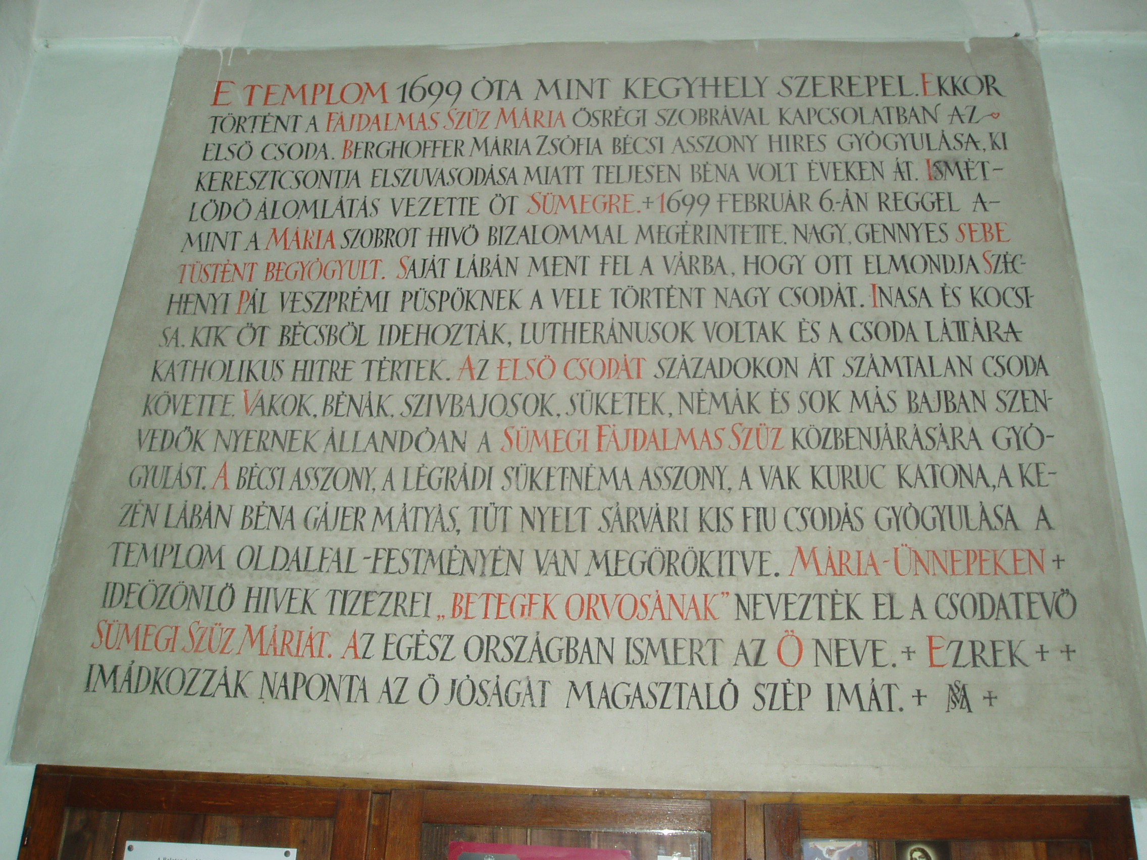 Nyilvános 1020 | 1712 | Sümeg, Szent István tér 7. Ferences templom | A ferences kolostor és templom épülettömbje a vár után (lásd: Sümeg, Vár) Sümeg legrégibb műemléke. A ferences atyákat a XVII. közepén Széchenyi György püspök hozta Sümegre a török elől idemenekült lakosság kedvéért. 1649 körül először az egyhajós, akkor még torony nélküli templom épült meg. A hozzá tartozó vastag falú, erődítmény jellegű kolostor néhány évvel később lett készen. A templom tornya és két oldalkápolnája 1724-33 között épült. Kiemelkedő értéket képvisel a két oldalkápolna kovácsoltvas kapuzata. (Sajnos, a templomot kívülről nem tudtam lefényképezni, szinte teljesen eltakarják a lombok. Talán majd egyszer télen... K. K.) Itt működött a XVII. századi ellenreformáció egyik fontos dunántúli központja. A szerzetesek járták a végvárakat és falvakat, s fejtettek ki térítő, illetve szociális tevékenységet, a kolostorban pedig messze vidéken híres hitvitákat tartottak. A lakosság kedvelte a ferences atyákat, akik a szegénység vállalása mellett a tudomány művelői, egyes tagjaik pedig a haza védelmében vitéz kardforgatók voltak. A templomot 1699 óta kegytemplomként is számon tartják. Ebben az évben ugyanis itt gyógyult meg a bécsi Berghoffer Mária, s a gyógyulást a templom főoltárán elhelyezett, a XVI. század elején faragott Pieta-szobornak tulajdonították. E szobor, mely a XVIII. században lebontott Szent Katalin-templomból származik, tűzvész következtében többször is megsérült, s helyreállításra szorult. A fénykép 2007 júniusában készült. Felh. irod.: Koppány Tibor - Kozák Károly: Sümeg útikalauz. Veszprém, Idegenforgalmi Hivatal, 1965 Látnivalók Veszprém megyében. Miskolc, Well-PRess, 2004 Sümegi kalauz. Sümeg, Sümegi Fórum alapítvány, 1993 Hőgyész László: Sümeg évszázadai. Veszprém, 1989 |