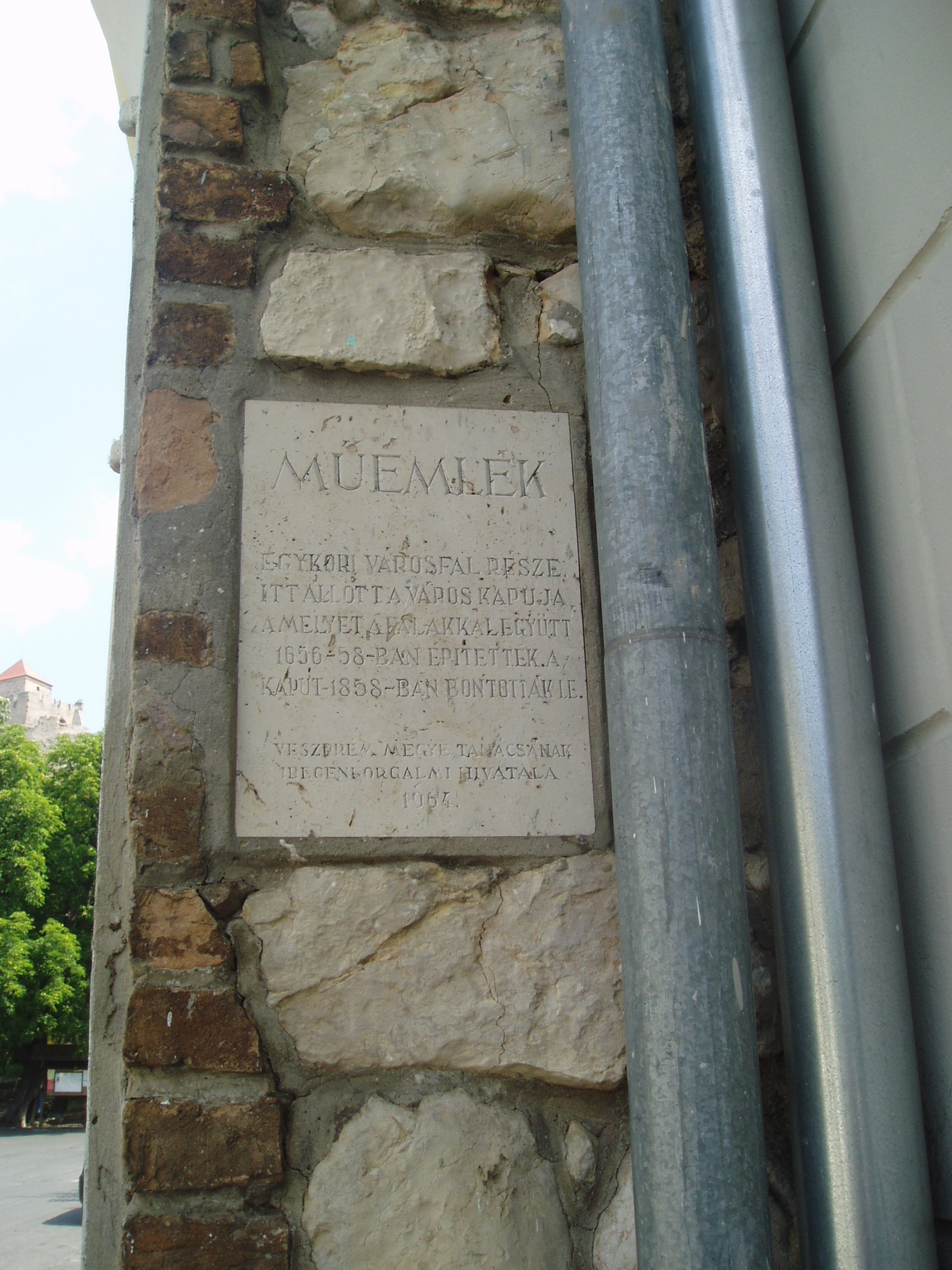Nyilvános 1021 | 1592 | Sümeg, Kisfaludy tér - Kossuth u. sarok | 1656 és 1658 között Széchenyi György püspök kőfalakkal kerítette be Sümeg városát. Az egykor 1100 méter hosszú, bástyákkal megerősített és kapukkal ellátott kőfalak maradványaival több helyen is lehet találkozni a város területén (lásd még: Sümeg, Kossuth u. 31). A képen az egyik, 1916-ban lebontott városkapu emléktáblája látható. A fénykép 2007 júniusában készült. Felh. irod.: Koppány Tibor - Kozák Károly: Sümeg útikalauz. Veszprém, Idegenforgalmi Hivatal, 1965 Látnivalók Veszprém megyében. Miskolc, Well-PRess, 2004 Sümegi kalauz. Sümeg, Sümegi Fórum alapítvány, 1993 |