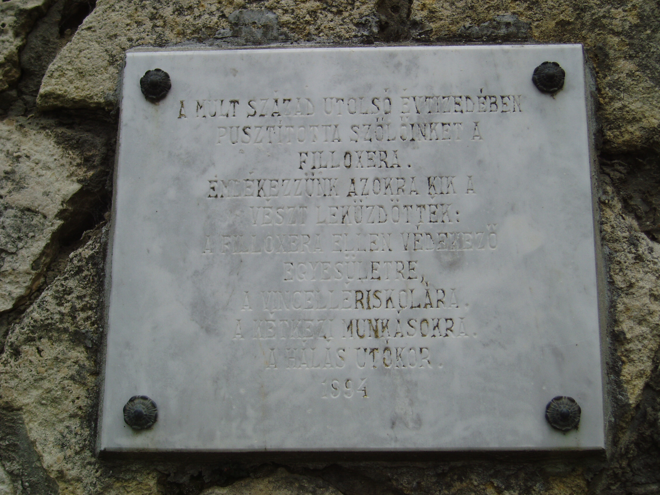 Nyilvános 953 | 1616 | Tapolca, Városi Panteonfal: a filoxéra elleni küzdelem emléktáblája | A Malom-tó mögött álló magas kőfal a Városi Panteonfal, amelyen több neves, tapolcai kötődésű személyiségnek állítottak emléktáblát. Az emléktáblát a XIX. század utolsó évtizedében a szőlőt pusztító filoxéra leküzdői emlékére - a Filoxéra Ellen Védekező Egyesület, a Vincellériskola és a névtelen kétkezi munkások - emlékére 1994-ben avatták fel. A felvétel 2007 februárjában készült. Felh. irod.: Bándi László: Emlékhelyek Veszprém megyében. Veszprém, 1996 www.tapolca.hu |