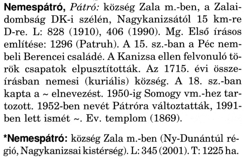 Nyilvános 1954 | 6026 | A szócikk felismertetett szövege: | (A csillag után a kiegészítő kötetből származó szöveg következik) Nemespátró, Pátró: község Zala m.-ben, a Zalaidombság DK-i szélén, Nagykanizsától 15 km-re D-re. L: 828 (1910), 406 (1990). Mg. Első írásos említése: 1296 (Patruh). A 15. sz.-ban a Péc nembeli Berencei családé. A Kanizsa ellen felvonuló török csapatok elpusztították. Az 1715. évi összeírásban nemesi (kuriális) község. A 18. sz.-ban kapta a ~ elnevezést. 1950-ig Somogy vm.-hez tartozott. 1952-ben nevét Pátróra változtatták, 1991-ben lett ismét ~. Ev. templom (1869). *Nemespátró: község Zala m.-ben (Ny-Dunántúl régió, Nagykanizsai kistérség). L: 345 (2001). T: 1225 ha. A szócikkek a következő lexikonból származnak: Cím: Magyar nagylexikon Közreműködő: Élesztős László (1949) (szerk.) ; Barabás Éva (1943) (szerk.) ; Berényi Gábor (1946) (szerk.) ; Bárány Lászlóné (szerk.) ; Adelmann-né Kertész Judit (1945) (közrem.) ; Froemel Károlyné Jáky Éva (1936) (közrem.) ; Akadémiai Kiadó és Nyomda Vállala Szerz. közl.: [... Élesztős László főszerk.] ; [szerk. Barabás Éva et al.] ; [bibliogr. Adelmanné Kertész Judit] ; [kész. az Akadémiai Kiadó Magyar Nagylexikon Szerkesztőségében] Kiadás: Budapest : Akad. K., 1993- Kötetei: 1. köt., A - Anc 2. köt., And - Bag 3. köt., Bah - Bij 4. köt., Bik - Bz 5. köt., C - Csem 6. köt., Csen - Ec 7. köt., Ed - Fe 8. köt., Ff - Gyep 9. köt., Gyer - Iq 10. köt., Ir - Kip 11. köt., Kir - Lem 12. köt., Len - Mep 13. köt., Mer - Nyk 14. köt., Nyl - Pom 15. köt., Pon - Sek 16. köt., Sel - Szö 17. köt., Szp - Ung 18. köt., Unh - Z 19. köt., Kiegészítő kötet, A - Z ETO jelzet: 030=945.11 Szakjelzet: 030 Cutter: M 14 ISBN: 963-05-6611-7 [!ISBN 963-05-6615-X] Nyelv: magyar Megjegyzés: Az 5. kötettől kiad. a Magyar Nagylexikon Kiadó ; A 6. kötettől főszerk. Berényi Gábor ; A 6. kötettől szakszerk. Bárány Lászlóné et al. ; A 6. kötettől bibliogr. Froemel Károlyné ; Bibliogr. a szócikkek végén |