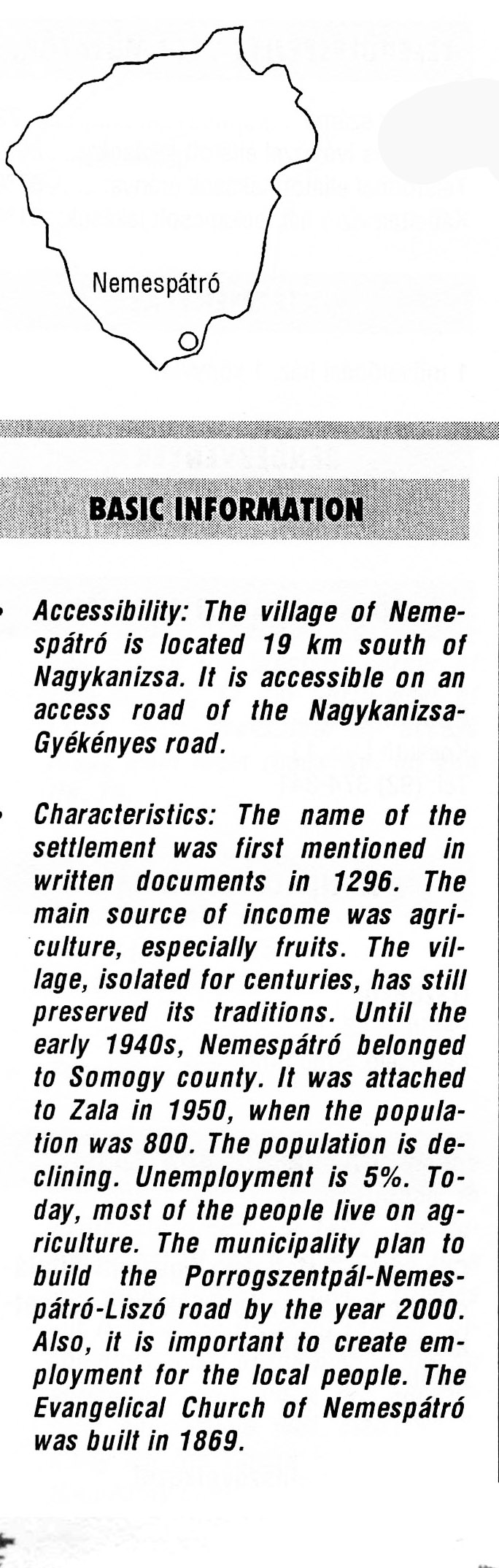 Nyilvános 2074 | 8138 | Nemespátró | BASIC INFORMATION Accessibility: The village of Nemespátró is located 19 km south of Nagykanizsa. It is accessible on an access road of the Nagykanizsa-Gyékényes road. Characteristics: The name of the settlement was first mentioned in written documents in 1296. The main source of income was agriculture, especially fruits. The village, isolated for centuries, has still preserved its traditions. Until the early 1940s, Nemespátró belonged to Somogy county. It was attached to Zala in 1950, when the population was 800. The population is declining. Unemployment is 5%. Today, most of the people live on agriculture. The municipality plan to build the Porrogszentpál-Nemes-pátró-Liszó road by the year 2000. Also, it is important to create employment for the local people. The Evangelical Church of Nemespátró was built in 1869. This text came from the following book: Title: Handbook of Zala county (Zala megye kézikönyve) Series: County handbooks of Hungary (Magyarország megyei kézikönyvei) Chief editor: Hóbor József Publisher: (Hatvan), CEBA-Hungary Ltd, 1998 ETO: 908.439.121(035) ; 050.8(439.121) ISBN: 963-9089-18-2 Pages: 488-1040 p. Remark: Closed on: 1998. márc. 31. |