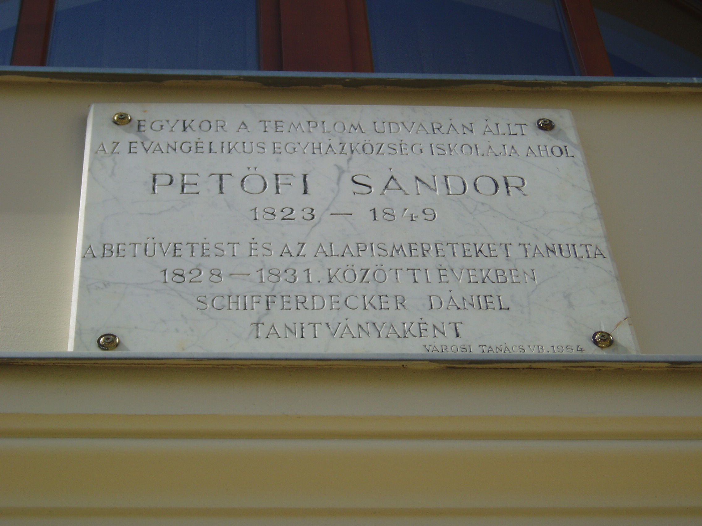 Nyilvános 1234 | 2382 | Kecskemét, Arany János utca 1. | Az Ybl Miklós által tervezett evangélikus templom mellett áll az Evangélikus Egyház Lelkészi Hivatalának épülete. Rajta márványtábla idézi Petőfi Sándor emlékét, aki itt, az egykor ezen a helyen állott elemi iskolában tanult kisiskolás korában. Egy másik, ugyanerre vonatkozó emléktáblát a közelben álló Szabadság tér 3. számú épületen is elhelyeztek. A fénykép 2006 augusztusában készült. Felh. irod.: Heltai Nándor: Kecskemét. Kecskeméti Lapok, 1998 |