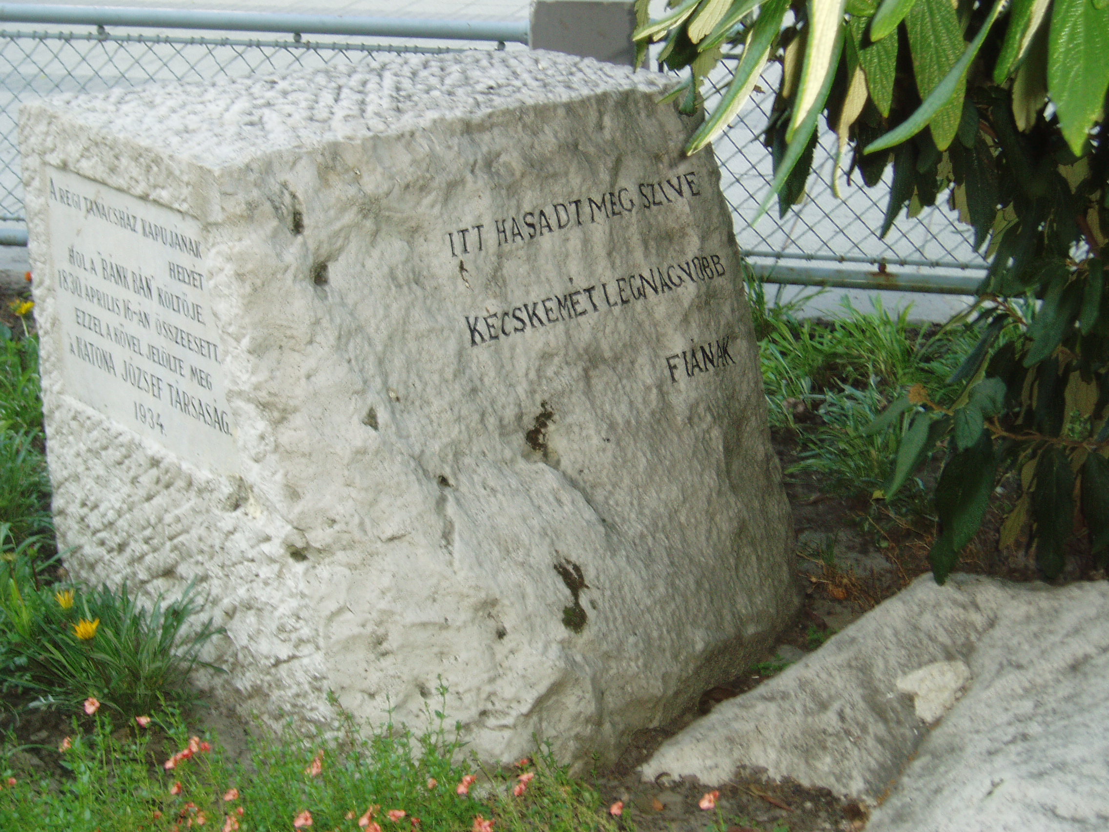 Nyilvános 1056 | 1763 | Kecskemét, Kossuth tér 1. | A szecessziós stílusú városháza 1892-1896 között épült Lechner Ödön és Pártos Gyula tervei szerint. Helyén egykor a régi városháza állott, ott dolgozott Katona József, mint városi ügyész, majd főügyész. Egy zsúfolt délelőtt után, miután megebédelt, egy kollégájával beszélgetve visszafelé tartott hivatalába, amikor a belső folyosón összeesett és szívszélhűdésben elhunyt. Halálának helyén, amely a mai épület előtt található, emlékkövet helyeztek el 1934-ben a következő szöveggel: "Itt hasadt meg a szíve Kecskemét legnagyobb fiának". A fénykép 2006 augusztusában készült. Felh. irod.: Heltai Nándor: Kecskemét. Kecskeméti Lapok, 1998 |