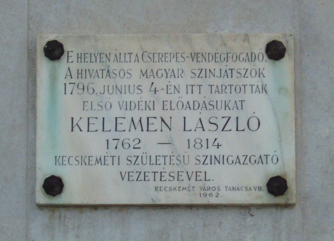 Nyilvános 1118 | 1967 | Kecskemét, Piaristák tere 7. | Az 1950-ben épült kocka alakú, háromszintes SZTK rendelőintézet helyén az 1773–1776 között épített Arany Sas vendégfogadó állott, amelyet a kecskemétiek csak Cserepes néven emlegettek. Udvari fészerében a XVIII. század legvégén alkalmi színpadot alakítottak ki, itt szerepeltek először a városban hivatásos magyar színjátszók, az Első Magyar Játékszíni Társaság. Vezetőjük a kecskeméti születésű Kelemen László volt. Kelemen Lászlóék első kecskeméti előadását Liszka Béla helybeli főreáliskolai tanár keltezte 1796-ra. Újabb vélemények szerint azonban az első hivatásos magyar nyelvű színtársulat csak 1800 nyarán lépett fel Kecskeméten. 1800-ban még Kelemen társulatának tagja volt a szintén kecskeméti születésű és az 1780-as években a piarista gimnáziumban (lásd: Kecskemét, Jókai u. 1.) diákoskodott Szerelemhegyi András, aki színészként és/vagy zenei mindenesként valószínűleg közreműködött a „Cserepes” udvarán megtartott előadásokon. Az Arany Sas fogadóban kecskeméti tanulmányainak megkezdésekor megszállt Jókai Mór, 1857-es országjárása idején pedig Ferenc József és felesége, Erzsébet királyné. Később az épület járásbíróság, majd kórház lett. 1948-ban lebontották s két év múlva emelték helyére a ma is álló épületet. A rendelőintézet Piaristák terére néző falán 1962-ben emléktáblát helyeztek el. A fénykép 2006 augusztusában készült. Felh. irod.: Heltai Nándor: Kecskemét. Kecskeméti Lapok, 1998 Bács-Kiskun megyei történeti és kegyeleti emlékhelyek számbavétele. Kecskemét, 1989. Birck Edit: A Duna–Tisza köze irodalmi országútjain. = Honismeret 2001. 3. |
