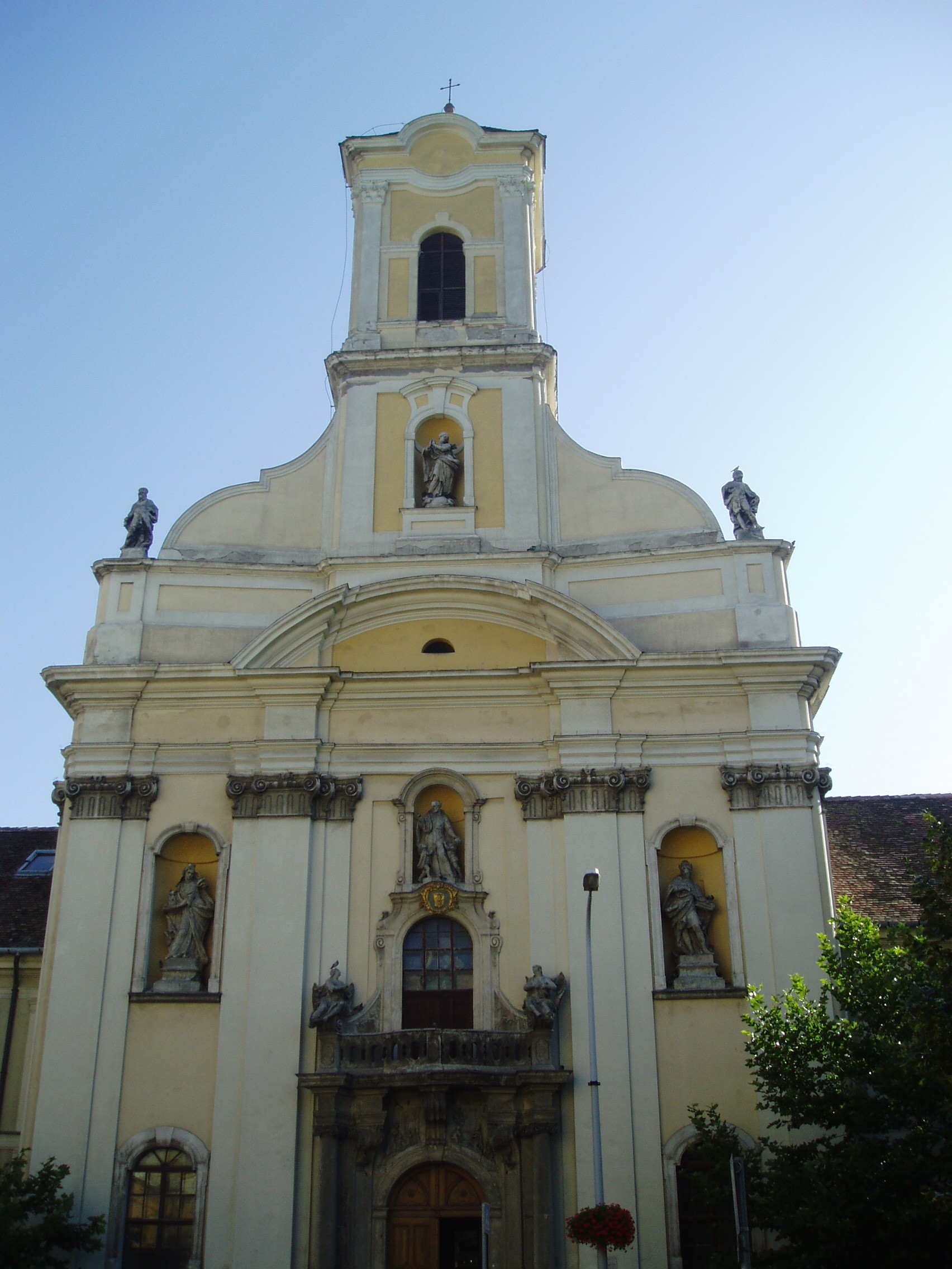 Nyilvános 1036 | 1660 | Kecskemét, Jókai utca 1. Piarista templom | A műemléki védelemmel óvott piarista templom és rendház a város legszebb barokk épületegyüttese. A piarista atyákat a város egyik földesura, gróf Koháry István telepítette le Kecskeméten a XVIII. század elején, s 1712-ben alapítványt is tett templomuk, rendházuk és iskolájuk felépítésére. Az épületegyüttes fokozatosan, több ütemben készült el. A templomot nagy valószínűséggel Mayerhoffer András tervezte. Mint Heltai Nándor helytörténész írja, a templom máig őrzi a reneszánszot felváltó új stílus, a barokk kezdeti frissességét, derűjét. A fénykép 2006 augusztusában készült. Felh. irod.: Heltai Nándor: Kecskemét. Kecskeméti Lapok, 1998 |