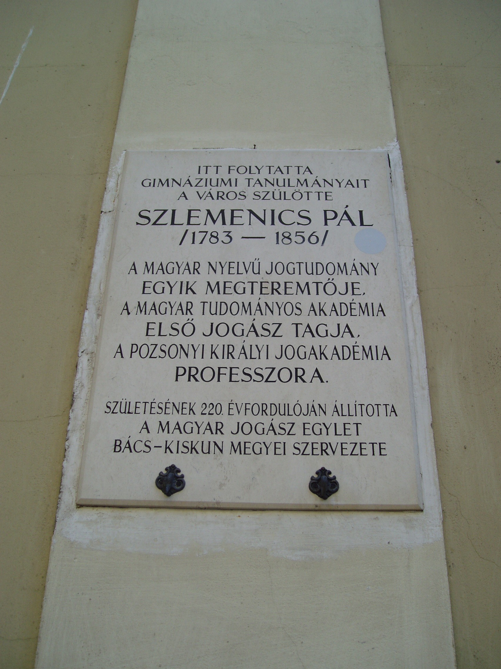 Nyilvános 1103 | 1703 | Kecskemét, Jókai utca 1. Piarista rendház és kollégium | A műemléki védelemmel óvott piarista rendház a mellette álló templommal együtt a város legszebb barokk épületegyüttese. A piarista atyákat a város egyik földesura, gróf Koháry István telepítette le Kecskeméten a XVIII. század elején, s 1712-ben alapítványt is tett templomuk, rendházuk és iskolájuk felépítésére. Az épületegyüttes fokozatosan, több ütemben készült el. A templomot nagy valószínűséggel Mayerhoffer András tervezte. Az oktatást a templom bal oldalán álló, 1720 és 1725 között, Paithmüller József tervei alapján emelt rendház helyiségeiben kezdték el. A jobb oldali iskolai szárnyat 1825–1832 között emelték, majd folyamatosan bővítették az épületet. Tanítás 1933-ig folyt benne. Ide járt iskolába 1804 és 1807 között Katona József, 1813-1815 között Táncsics Mihály, 1833-34-ben Klapka György, később Sík Sándor. Itt tanult az 1780-as években Szerelemhegyi Liebenberger András, a magyar zenés játék megteremtője, karnagy, valamint testvére, Lunkányi (Liebenber) János, Széchenyi István nevelője, műveinek első bírálója. A képen Szlemenics Pál (1783-1856) emléktáblája látható. A magyar nyelvű jogtudomány egyik megteremtője, a Magyar Tudományos Akadémia első jogász tagja, a pozsonyi Királyi Jogakadémia kecskeméti születésű professzora is ide járt gimnáziumba. A fénykép 2006 augusztusában készült. Felh. irod.: Heltai Nándor: Kecskemét. Kecskeméti Lapok, 1998 |