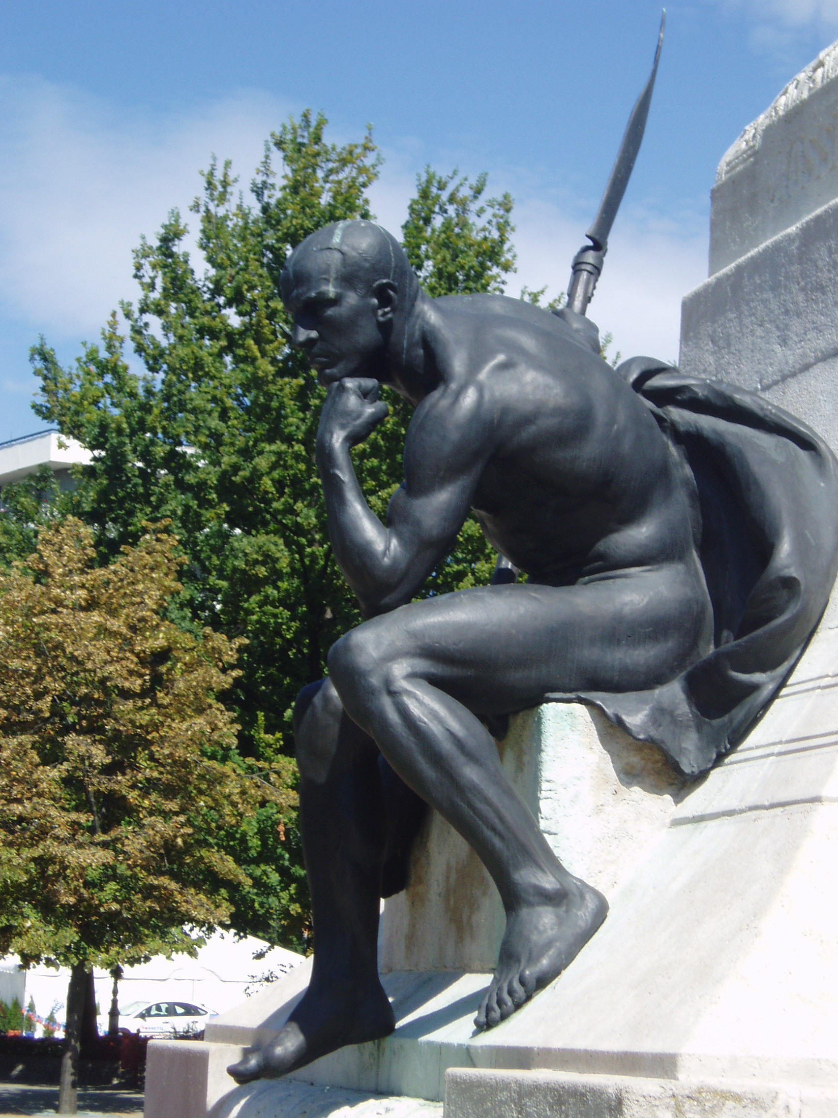Nyilvános 1064 | 1874 | Kecskemét, Kossuth tér: Kossuth Lajos szobra, mellékalak | Kossuth Lajos 2 és fél méter magas bronzszobrát, Telcs Ede alkotását 1906-ban avatták fel Kecskemét központjában. Az alkotás az 1848/49-es forradalom és szabadságharc emléke mellett Kossuth 1848. szeptember 25-én — ugyanezen a helyen, az akkori régi vásártéren — elmondott toborzó beszédét is felidézi. A szobor ülő mellékalakja kiegyenesített kaszát tart a kezében. E mellékalakról maga a szobrász mondta, hogy ugyan Rodin: Gondolkodó című híres szobrához nagyon hasonló pózban ül, de megfeszített izmokkal, készen rá, hogy ha Kossuth „mégegyszer azt üzeni”, a kezében tartott kiegyenesített kaszával rögtön rámenjen az osztrákra. A helyi hagyomány szerint e mellékalak modellje Kacsóh Pongrác, a János vitéz alapján írt daljáték zeneszerzője volt. A fénykép 2006 augusztusában készült. Felh. irod.: Heltai Nándor: Kecskemét. Kecskeméti Lapok, 1998 Orosz Andrea: Kiskunság és Felső-Bácska. Bp. Frigoria, 2004 |