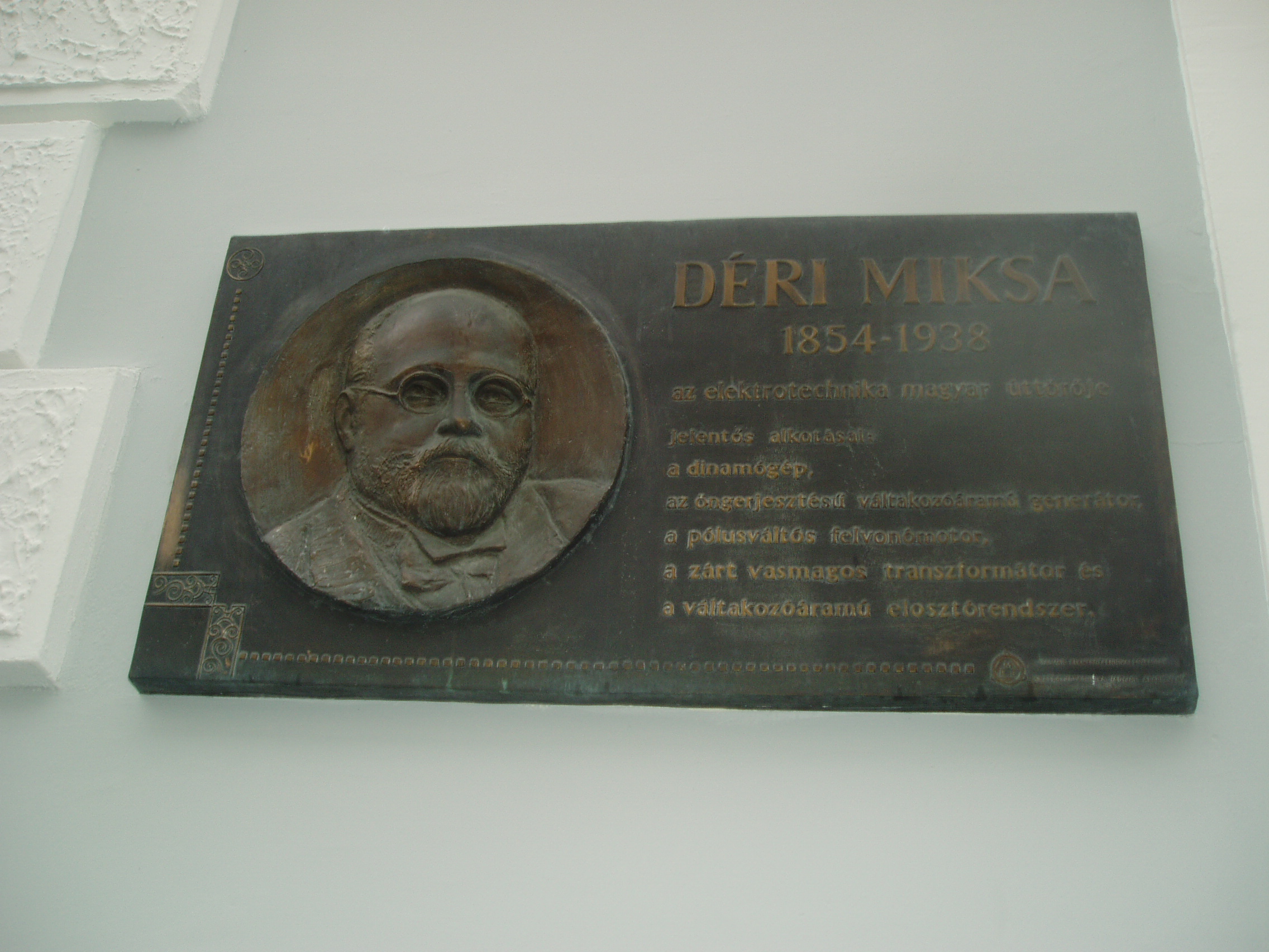Nyilvános 1086 | 1897 | Baja, Déri Miksa köz: Déri Miksa emléktáblája | A róla elnevezett kis belvárosi közre néző épület falán elhelyezték a névadó emléktábláját. Déri Miksa (1854-1938) a korszerű elektrotechnika elméleti és gyakorlati megalapozója, a transzformátor egyik felfedezője volt. Az egykori Bács-Bodrog megye déli részén fekvő Bács községben született gazdag kereskedőcsalád sarjaként. Testvére volt Déri Frigyes (lásd: Baja, Déri kert) és Déri Kálmán festőművész. A bajai cisztercita gimnáziumba (lásd: Baja, Szent Imre tér 5.) járt, műszaki tanulmányait a budapesti József Műegyetem mérnöki szakosztályán kezdte el, vízépítő-mérnöki oklevelet 1877-ben szerzett a Bécsi Műegyetemen. Először folyamszabályozási munkákban vett részt a fővárosban és Szegeden, de már ekkor foglalkoztatta a villamosság. Zipernowsky Károly - akivel még az első elektrotechnikai próbálkozások idején ismeretséget kötött - 1882-ben munkatársul fogadta és Déri belépett a Ganz gyár Elektromos Osztályára. Közös munkájuk első eredménye az öngerjesztésű váltakozó áramú generátor volt. Déri 1883-tól kezdve Bécsben dolgozott a gyár ausztriai képviselőjeként, de a kutatói munkát Zipernowskyval továbbra is rendszeresen folytatták. Kiváló munkatársat kaptak Bláthy Ottó személyében, aki szintén a Ganznál dolgozott gépszerkesztőként. Nagyrészt a három feltalálónak köszönhetően a Ganz gyár néhány éven belül tekintélyes, nemzetközi jelentőségű vállalattá fejlődött. Bláthy ötletére 1885-ben megalkották a zárt vasmagú transzformátort, amelynek megalkotásában Déri a kísérleti munka oroszlánrészét végezte. Szabadalmukat Zipernowsky-Déri-Bláthy (ZBD) transzformátor néven ismerte meg a világ. 1889-től Déri az akkor alapított bécsi Internationale Électricitäts Gesellschaft vezető igazgatója lett, még ebben az évben megszervezte és berendezte a bécsi villamos-erőművet. Bécs város villamos világításának koncesszióját a bécsi Union Bank és a Ganz-gyár nyerték el, e két vállalat alapította az I.E.G. vállalatot, amelynek Déri 1896-ig volt igazgatója. A vállalat az első olyan vállalkozás volt Európában, amely kizárólag villamos erőművek létesítésének pénzügyi szolgáltatása céljából alakult meg. Néhány év alatt 60 Monarchia-beli transzformátor telep kiépítésében vett részt. Déri Miksa számos egyéni, valamint Zipernowskyval és Bláthyval közösen kifejlesztett találmányt is magáénak mondhat. 1898 és 1902 között kidolgozta kompenzált egyenáramú gépét, majd 1903-1904-ben kifejlesztette a kétkefe-rendszerű egyfázisú repulziós motorát, amelyet a világirodalom Déri-motor néven ismer. 1938. március 5-én hunyt el 84 éves korában Merano-ban, ahol nyugalomba vonulva élt. A fénykép 2007 októberében készült. Felh. irod.: www.industrianet.hu/UserFiles/ehsz/Deri_Miksa.htm |