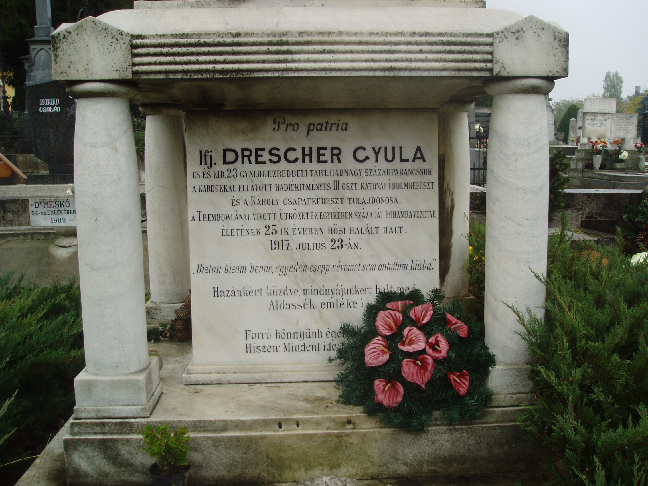 Nyilvános 1031 | 2092 | Baja, Rókus utva: Rókus temető - Drescher Gyula sírja | Itt nyugszik ifj. Drescher Gyula, a 23. gyalogezred tartalékos hadnagya, századparancsnok. Hősi halált halt életének 25. évében, 1917. november 23-án. A fénykép 2007 októberében készült. |