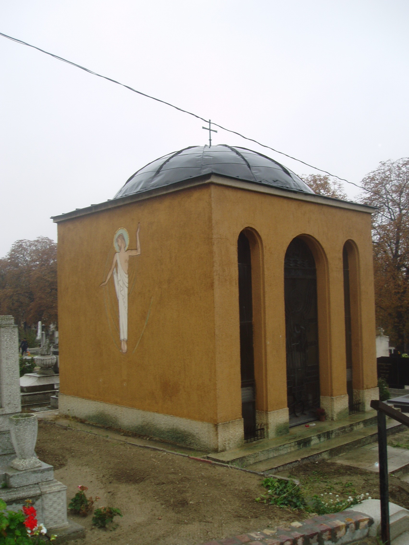 Nyilvános 976 | 1828 | Baja, Rókus utca: Rókus temető: az Éber család kriptája | A temetőkápolna közelében áll az Éber család kriptája. Más családtagok körében itt nyugszik Éber Sándor (1878-1947) festőművész, fia, ifj. Éber Sándor 1909-1985) és leánya, az 1905-ben született és közelmúltban elhunyt (pontos évszámot sehol nem találtam) Éber Anna festőművészek. A kriptát valószínűleg ifj. Éber Sándor tervezte, de sajnos erről sem találtam semmilyen forrást. A művészcsalád egykori otthona ma Éber Emlékházként látogatható (lásd: Baja, Jókai u. 19.). A fénykép 2007 októberében készült. |