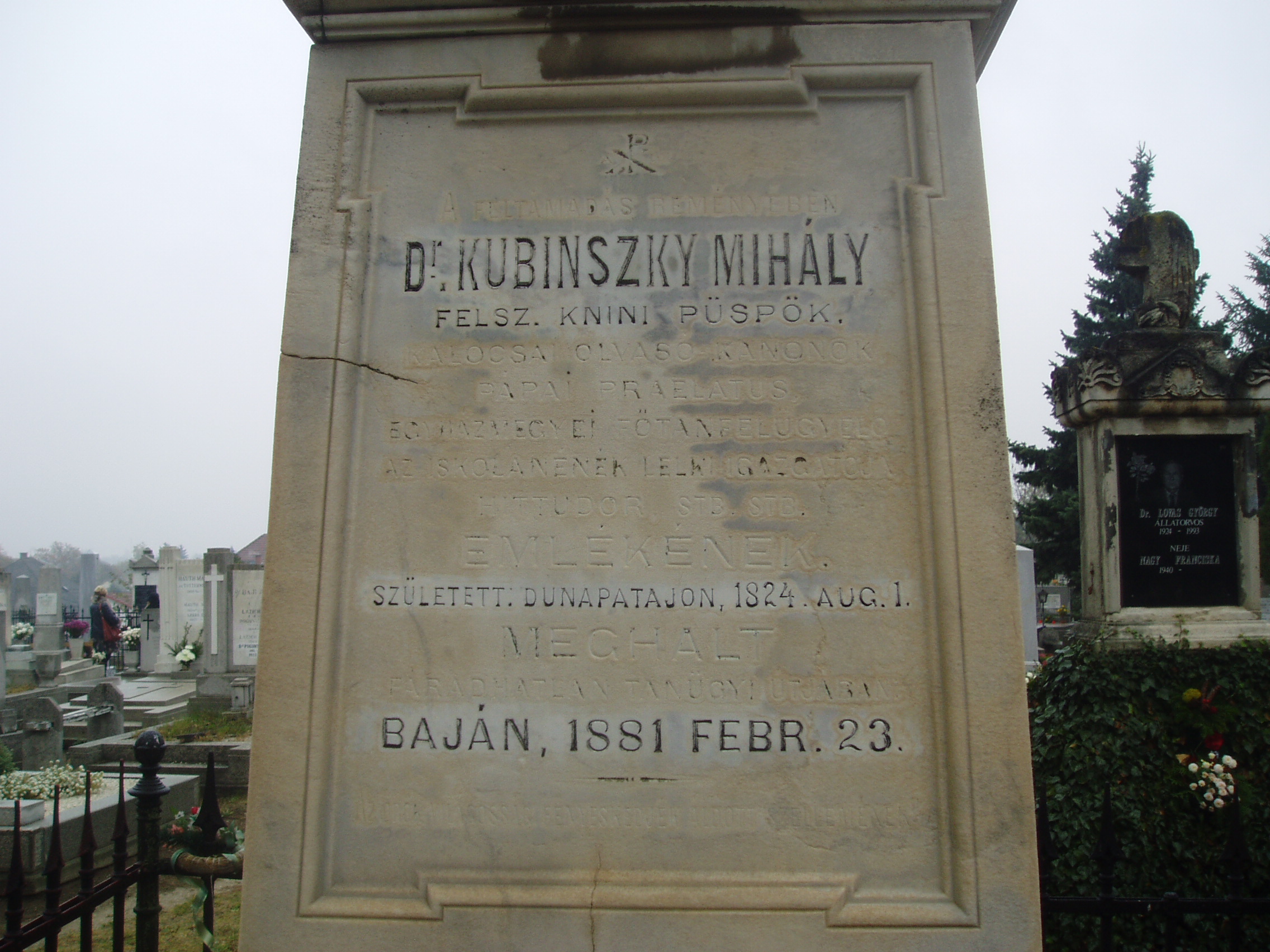 Nyilvános 1122 | 3789 | Baja, Rókus utca: Rókus temető - Kubinszky Mihály sírja | A Rókus temetőben nyugszik a Baján elhunyt Kubinszky Mihály (1824-1881), címzetes tinnini püspök, pápai prelátus, egyházmegyei főfelügyelő, a magyar tanárképzés egyik előmozdítója. Jelentős adománnyal járult hozzá a kalocsai iskolanővérek bajai iskolájának (lásd: Baja, Katona József u. 1-3.) felépítéséhez. Kubinszky a csángók egyik első magyarországi kutatója is volt, s a Szent László Társulat keretén belül lépéseket tett egy ottani magyar nyelvű tanítóképző felállítása érdekében. Síremlékét a Bajavidéki Rk. Néptanítói Egylet közadakozásból állíttatta fel. A fénykép 2007 októberében készült. Felh. irod.: www.c3.hu/~aevk/hely_ism.html Vincze Gábor: A moldvai magyar etnikai csoport a román nemzetépítés árnyékában. = www.csango.hu |