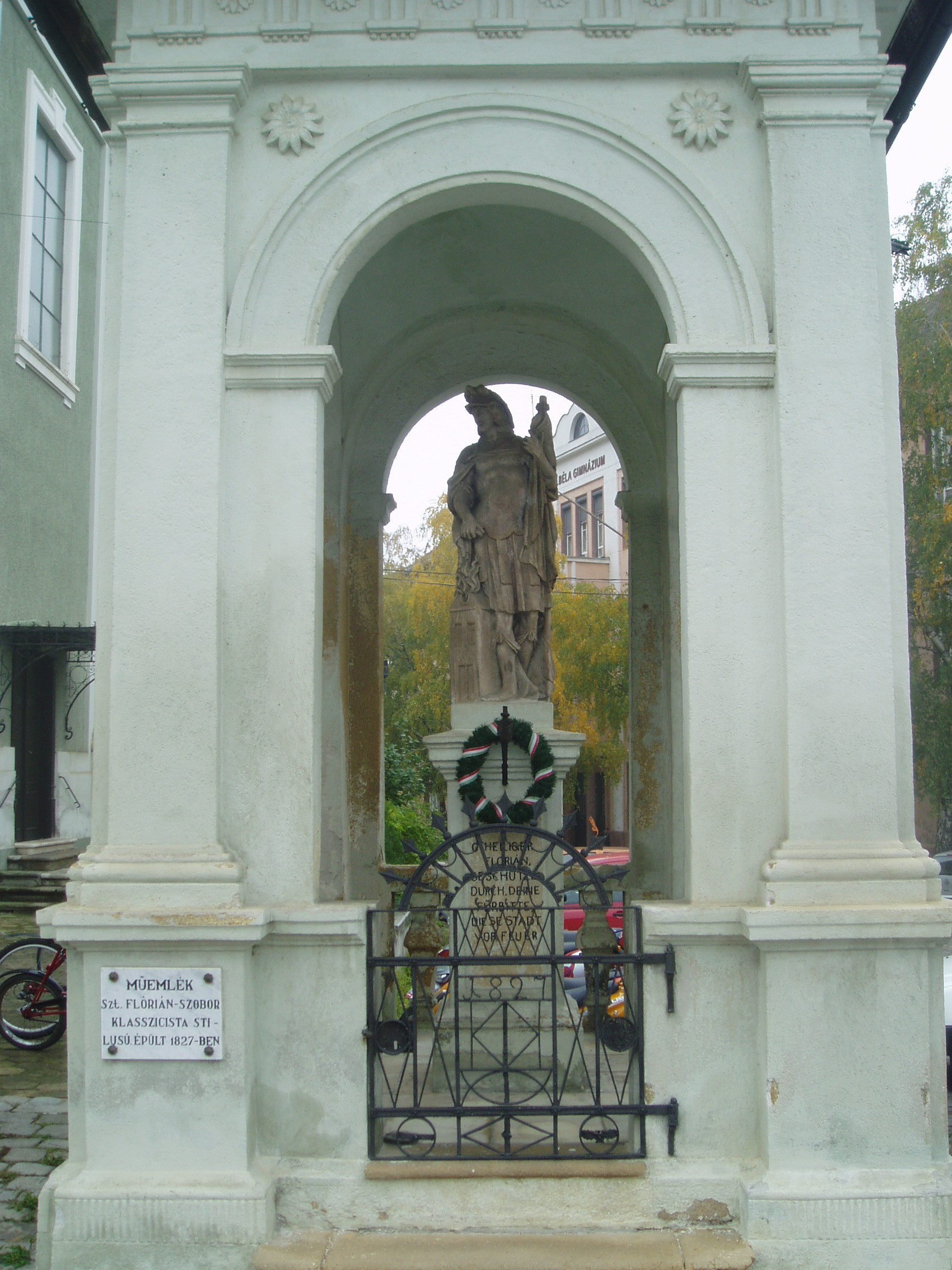 Nyilvános 1089 | 2071 | Baja, Szent Imre tér 5. Szent Flórián-szobor | A plébániatemplom melletti szoborfülkében áll 1827 óta Domenico Berti kőfaragó Szent Flóriánt ábrázoló, klasszicista stílusú szobra. A tűzoltók védőszentjének szobrát egy tekintélyes bajai polgár, Arnó György állíttatta azzal a fohásszal, hogy Szent Flórián védelmezze meg a várost a tűztől. Az első jelentős tűzvész, amiről források szólnak, 1742-ben pusztított Baján. Az ezt követő másfél évszázadban több mint ezerszer lobbant fel tűz a városban. Nagy tűz volt 1806-ban és 1819-ben, 1840-ben pedig az egész város leégett. A fénykép 2007 októberében készült. Felh. irod.: www.vendegvaro.hu Gál Zoltán: A bajai tűzoltóság hőskora. = www.bacskaisport.hu |