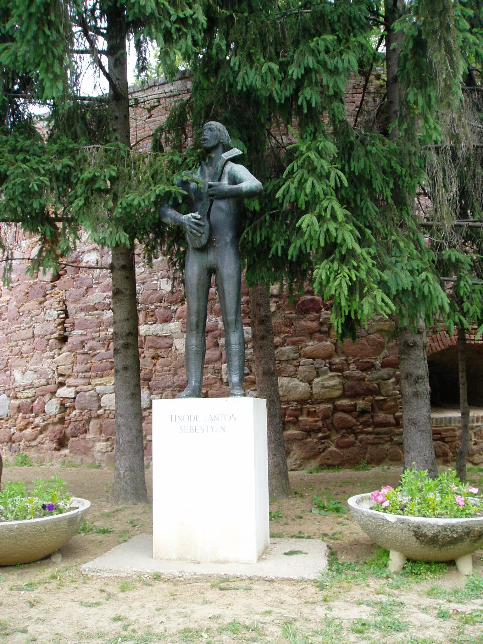 Nyilvános 1092 | 1733 | Szigetvár, Vár: Tinódi Lantos Sebestyén szobra | Kiss István Tinódi Lantos Sebestyént ábrázoló szobra a vár déli kapujánál áll. Tinódi Lantos Sebestyén (1515 k. - 1556), a magyar reneszánsz neves lantos-énekmondója a közelben, a mai Rózsafa és Nagypeterd községek közötti, azóta elpusztult faluban, Tinódon született. Szigetváron Török Bálint alatt szolgált. A fénykép 2005 júniusában készült. |