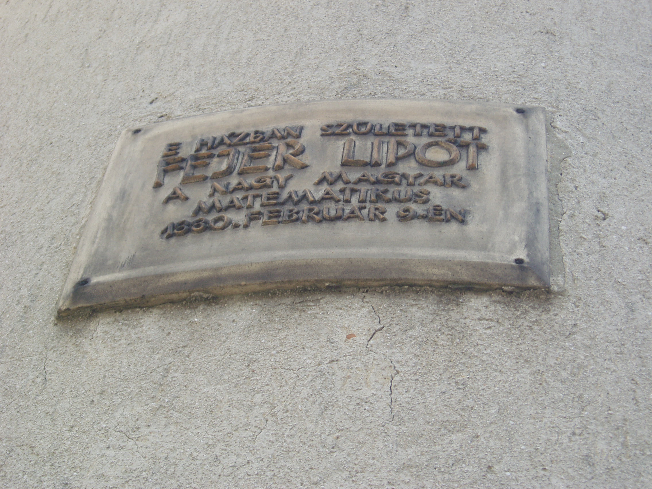 Nyilvános 1498 | 3223 | Pécs, Anna utca 16. | Mint a homlokzatán elhelyezett emléktábla is tanúsítja, ebben a házban született 1880. február 9-én Fejér Lipót 1880-19599, a nagy magyar matematikus. Édesanyja Goldberger Viktória, édesapja Weisz Samu kiskereskedő. Anyai dédapja Nachod Sámuel orvos, nagyapja Goldberger József, az első magyar–héber társalgási nyelvkönyv szerzője. Elemi iskoláit Pécsett végezte, ugyanitt érettségizett 1897-ben a főreáliskolában. A főreáliskola első éveit nehezen végezte, matematikából magántanárt kellett mellé fogadni... Budapesti és berlini tanulmányai után 1905 - 1911 között a kolozsvári egyetemen, majd 1911-től haláláig a Budapesti Tudományegyetemen tanított. Körülötte alakult ki a világhírű Fejér-iskola (Csillag Pál, Egerváry Jenő, Erdős Pál, Fekete Mihály, Kalmár László, Lukács Ferenc, Pólya György, Riesz Marcel, Szász Ottó, Szegő Gábor, Szidon Simon, Turán Pál). A Fourier-sorok analízisén kívül jelentős eredményeket ért el a konstruktív függvénytanban (Fejér-interpoláció és mechanikus kvadratúra) és a komplex függvénytanban. A róla elnevezett Fejér-tétel a Fourier-sorok összegezhetőségére vonatkozik. „Kívülállónak nem lehet elmondani, hogy milyen volt Fejér Lipót. Óriás volt. Földöntúli vigasztalás a puszta lénye. Aki nem ismerte, az valamit nem tud a világról, és sohasem fogja megtudni.” (Ottlik Géza) A fénykép 2006 júliusában készült. Felh. irod.: www.info.omikk.bme.hu/archivum/magyarok/htm/fejerrov.htm Magyar életrajzi lexikon |