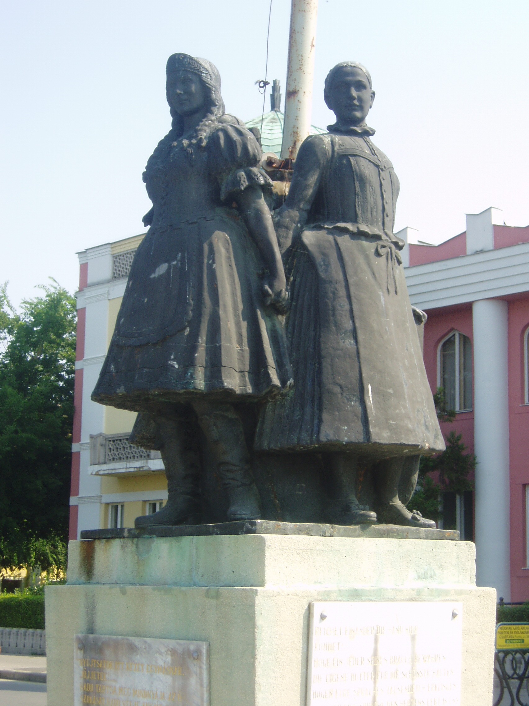 Nyilvános 1690 | 3479 | Mohács, Széchenyi tér | A Széchenyi tér a város fő tere, középpontjában emelkedik a Fogadalmi templom, keleti oldalán pedig az 1926-ban, a mohácsi csata 400. évfordulója alkalmából Árkay Aladár tervei szerint épített városháza. A városháza előtt 1932-ben állították fel Martinelli Jenő harmonikus szoborkompozícióját: a sokác, magyar és német népviseletbe öltözött lányok szoboralakja a nemzetiségek békés egymás mellett élése szimbólumaként fogja egymás kezét. A szobor talapzatán a nagy német drámaíró és költő, G. E. Lessing versrészlete olvasható: „Nyújtsatok itt kezet egymásnak, jöjjetek! Hadd tartsa meg mindnyája az ő szokását, Hadd vélje anyját szebbnek mindenkinél. Hadd járjon azután a nyelvetek ezer felé. A szívnek csakis egy nyelve van közöttünk!” A fénykép 2006 júliusában készült. Felh. irod.: Látnivalók Pécsett és Baranyában. Miskolc, Well-PRess, 1998 www.mohacs.hu www.vendegvaro.hu |