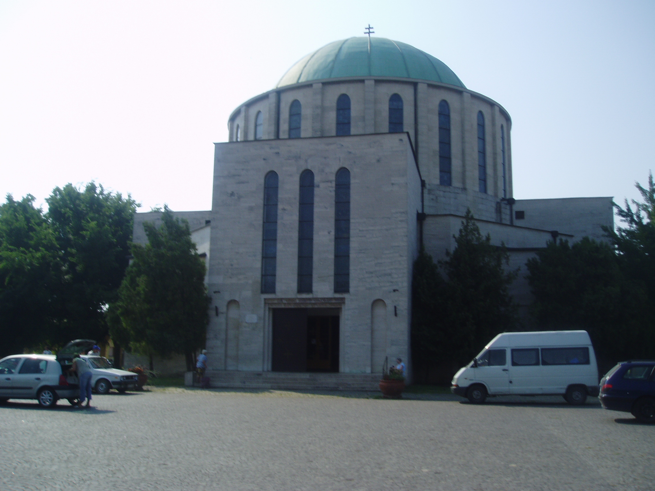 Nyilvános 1661 | 4678 | Mohács, Széchenyi tér: Fogadalmi templom | A város fő terének középpontjában áll a Fogadalmi templom hatalmas tömbje. A mohácsi csata 400. évfordulójára emlékezve építették 1929 és 1940 között, Árkay Aladár és Árkay Bertalan tervei alapján. A bizánci stílust követő, historizáló stílusú templom különlegessége, hogy alapjaiba háromezer magyar község, ötvenkét város és huszonöt megyeháza udvarából felvett egy-egy kilós földcsomagokat helyeztek el 1929-ben, jelképezve ezzel az ország összefogását. Az ország első betonhéjazatú építményének kupolája 30 méter magas és 20 méter átmérőjű, a templom 3600 fő befogadására alkalmas. Az épületben lévő műalkotások megörökítik a magyar történelem legfontosabb állomásait. Az íves oldalfalakat a középkori székesegyházakéra emlékeztető, szenteket ábrázoló üvegablakok díszítik, melyek Árkayné Sztehlo Lili (1897-1959) munkái. A kupola nonfiguratív ábrákkal teli ablakai 1984-ben Michael Gaussling német üvegművész munkája nyomán készültek. A templombelső mozaikképei, melyek Kolbe Mihály (1907-1990) mohácsi festőművész munkái, színeikkel és jelképeikkel az 1526-os mohácsi csatára utalnak. A Mohácsi Boldogasszonyként ismert régi Madonna-szobor eredete a török időkre nyúlik vissza. A fénykép 2006 júliusában készült. Felh. irod.: Látnivalók Pécsett és Baranyában. Miskolc, Well-PRess, 1998 www.mohacs.hu www.vendegvaro.hu |