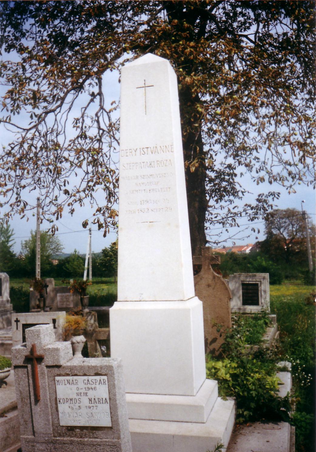 Nyilvános 1527 | 7424 | Miskolc, Szent Anna-temető: Déryné Széppataki Róza sírja | A Szent Anna templom fölött a domboldalon kis temető terül el. Itt van Déryné Széppataki Róza sírja. Déryné 1872. szeptember 29-én, 79 éves korában hunyt el miskolci otthonában, a mai Hunyadi utca 52. számot viselő ház kis udvari lakrészében. Ekkor már özvegyi sorban, szegénységben élt. Utolsó éveiben húgával, Johannával, Kilényi Dávid színigazgató özvegyével lakott együtt Sokáig csak egyszerű fakereszt jelölte sírját. Hogy most látható sírkövét pontosan mikor állították, a miskolci források nem közlik egyértelműen, csak annyi tudható, hogy a fehérmárvány obeliszket „a nemzeti kegyelet” emelte. Felirata: DÉRY ISTVÁNNÉ / SZÉPPATAKI RÓZA / MAGYAR SZÍNMŰVÉSZNŐ / HAMVAINAK / A NEMZETI KEGYELET / SZÜL. 1793. DEC 24 / MEGH. 1872 SZEPT 29 Húga, Johanna 1881 április 18-án hunyt el, Déryné mellé temették. Az ő ma is látható sírkövét „baráti emlékül emelte Latabár Endréné”, a híres miskolci színigazgató özvegye. A fénykép 2002 nyarán készült. Felh. irod.: Cenner Mihály: Déryné alkonya. = A Miskolci Herman Ottó Múzeum Közleményei 14/1975. Saád Andor: Emlékek Dérynéről és húgáról, Széppataki Johannáról. = A Miskolci Herman Ottó Múzeum Közleményei 8. |