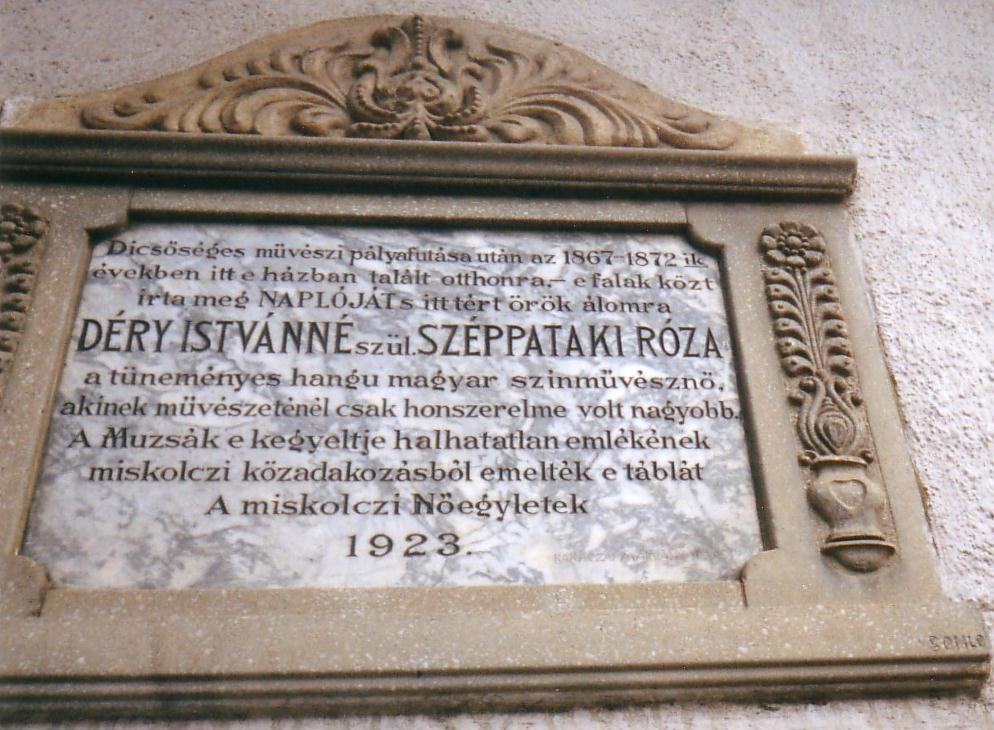 Nyilvános 1441 | 3564 | Miskolc, Hunyadi utca 52. | Ennek a háznak udvari kis lakrészében élt húgával együtt 1867-től haláláig, 1872-ig Déryné Széppataki Róza. A főépület utcai homlokzatát 1923-ban jelölték meg emléktáblával. A színi pályáról 1847-ben visszavonult színésznő–énekesnő férje halála után öt évvel költözött ide a szintén özvegyi sorban élő Kilényi Dávidné Széppataki Johannához, aki itt bérelt kis lakást. S nem sokkal később, egy miskolci meghitt barátnőjének, gondviselőjének Pesten élő könyvtáros fivére, Egervári Ödön biztatására itt, utolsó otthonában kezdte el írni híres emlékiratait. Benne kicsi gyermekkorától egész részletességgel beszéli el életét, pályáját. (Művét gyakran emlegetik naplóként is — helytelenül, mert jóval az események után vetette papírra.) Utolsó három évét ez töltötte ki: betegsége, gyengesége súlyosbodott, látása erősen meggyengült, többször hosszú heteken át nem tudott tollat venni a kezébe, de emberfeletti munkát végzett. Írásművének csak a terjedelme több, mint ezer nyomtatott oldal. A csodálatos memóriával megőrzött események leírása forrásként is felbecsülhetetlen, emellett nagy irodalmi értéke is van. Élete krónikájának papírra vetésével az 1840-es évek elejéig jutott el; 1872. szeptember 29-én hunyt el otthonában. Sírja is Miskolcon található (lásd: Szent Anna temető). A fénykép 2002 nyarán készült. Felh. irod.: Cenner Mihály: Déryné alkonya. = A Miskolci Herman Ottó Múzeum Közleményei 14/1975. Saád Andor: Emlékek Dérynéről és húgáról, Széppataki Johannáról. = A Miskolci Herman Ottó Múzeum Közleményei 8. |