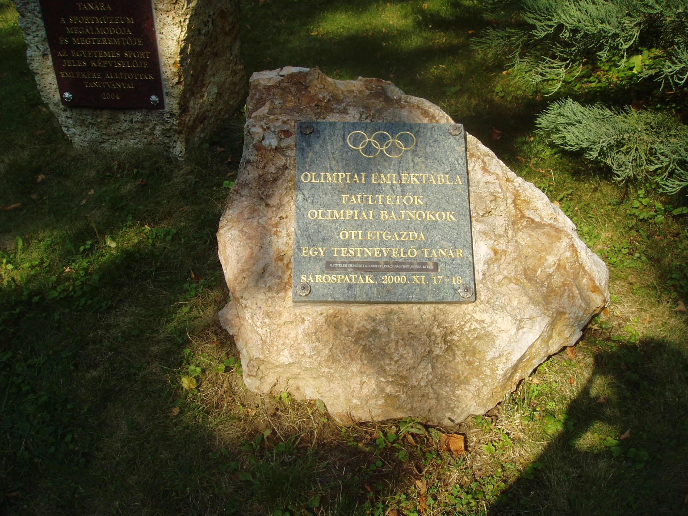 Nyilvános 968 | 1580 | Sárospatak, Iskolakert: A pataki diákok emlékezete | A Református Kollégium (lásd: Sárospatak, Rákóczi u. 1.) bejáratával szemben találjuk az Iskolakertnek nevezett parkot. Az 1980-as években természetvédelmi területté nyilvánított Iskolakert sajátos nemzeti érték, mely egyedülálló az országban. Sétányai mentén Patakhoz kötődő jeles személyiségek szobrai állnak. Az iskolakertben álló műemlék tornacsarnok közelében is elhelyeztek néhány feliratos emlékkövet. A képen a 2000-ben felállított Olimpiai emléktábla látható. A fénykép 2007 augusztusában készült. Felh. irod.: Látnivalók Borsod-Abaúj-Zemplén megyében. Miskolc, Well-PRess, 1995 |