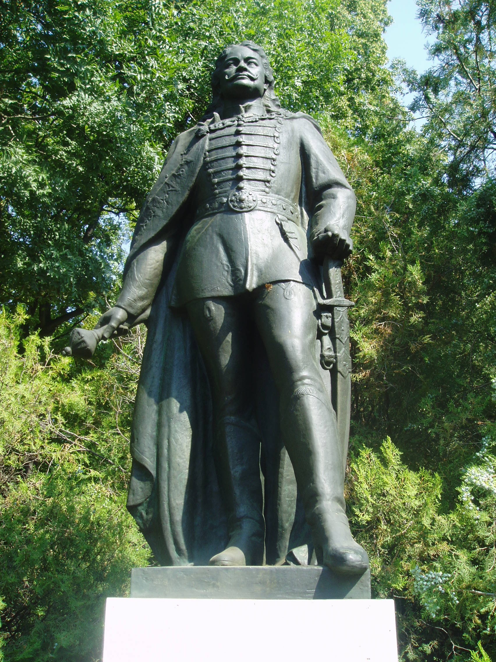 Nyilvános 1279 | 3173 | Sárospatak, Iskolakert bejárat: II. Rákóczi Ferenc | A Református Kollégium (lásd: Sárospatak, Rákóczi u. 1.) bejáratával szemben találjuk a hét hektáros Iskolakertet. Bejáratát két emlékmű fogja közre. II. Rákóczi Ferenc fejedelem egész alakos, bronz szobrát 1935-ben készítette Horváth Géza szobrászművész. A fénykép 2007 augusztusában készült. Felh. irod.: Látnivalók Borsod-Abaúj-Zemplén megyében. Miskolc, Well-PRess, 1995 |