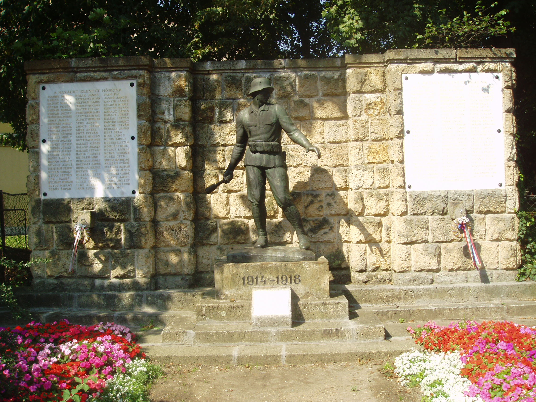 Nyilvános 1326 | 3541 | Sárospatak, Iskolakert bejárat: I. világháborús emlékmű | A Református Kollégium (lásd: Sárospatak, Rákóczi u. 1.) bejáratával szemben találjuk a hét hektáros Iskolakertet. Bejáratát két emlékmű fogja közre. A Táncsics utca felőli oldalon áll az I. világháború hőseinek emlékét idéző, gránátot dobó honvéd bronzszobra. Medgyessy Ferenc alkotását 1935-ben leplezték le. A fénykép 2007 augusztusában készült. Felh. irod.: www.vendegvaro.hu |